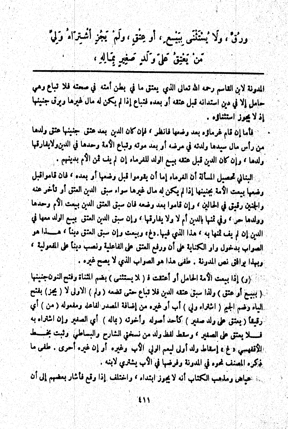 ـــــــــــــــــــــــــــــQالْمُدَوَّنَةِ لِابْنِ الْقَاسِمِ - رَحِمَهُ اللَّهُ تَعَالَى - الَّذِي يُعْتِقُ مَا فِي بَطْنِ أَمَتِهِ فِي صِحَّتِهِ فَلَا تُبَاعُ وَهِيَ حَامِلٌ إلَّا فِي دَيْنٍ اسْتَدَانَهُ قَبْلَ عِتْقِهِ أَوْ بَعْدَهُ فَتُبَاعُ إذَا لَمْ يَكُنْ لَهُ مَالٌ غَيْرُهَا وَيَرِقُّ جَنِينُهَا إذْ لَا يَجُوزُ اسْتِثْنَاؤُهُ. فَأَمَّا إنْ قَامَ غُرَمَاؤُهُ بَعْدَ وَضْعِهَا فَانْظُرْ، فَإِنْ كَانَ الدَّيْنُ بَعْدَ عِتْقِ جَنِينِهَا عَتَقَ وَلَدُهَا مِنْ رَأْسِ مَالِ سَيِّدِهَا وَلَدَتْهُ فِي مَرَضِهِ أَوْ بَعْدَ مَوْتِهِ وَتُبَاعُ الْأَمَةُ وَحْدَهَا فِي الدَّيْنِ وَلَا يُفَارِقُهَا وَلَدُهَا، وَإِنْ كَانَ الدَّيْنُ قَبْلَ عِتْقِهِ بِيعَ الْوَلَدُ لِلْغُرَمَاءِ إنْ لَمْ يَفِ ثَمَنُ الْأُمِّ بِدَيْنِهِمْ. الْبُنَانِيُّ تَحْصِيلُ الْمَسْأَلَةِ أَنَّ الْغُرَمَاءَ إمَّا أَنْ يَقُومُوا قَبْلَ وَضْعِهَا أَوْ بَعْدَهُ، فَإِنْ قَامُوا قَبْلَ وَضْعِهَا بِيعَتْ الْأَمَةُ بِجَنِينِهَا إذَا لَمْ يَكُنْ لَهُ مَالٌ غَيْرَهَا سَوَاءٌ سَبَقَ الدَّيْنُ الْعِتْقَ أَوْ تَأَخَّرَ عَنْهُ وَالْجَنِينُ رَقِيقٌ فِي الْحَالَيْنِ، وَإِنْ قَامُوا بَعْدَ وَضْعِهِ فَإِنْ سَبَقَ الْعِتْقُ الدَّيْنَ بِيعَتْ الْأُمُّ وَحْدَهَا وَوَلَدُهَا حُرٌّ، وَفَّى ثَمَنُهَا بِالدَّيْنِ أَمْ لَا وَلَا يُفَارِقُهَا، وَإِنْ سَبَقَ الدَّيْنُ الْعِتْقَ بِيعَ الْوَلَدُ مَعَهَا فِي الدَّيْنِ إنْ لَمْ يَفِ ثَمَنُهَا بِهِ، هَذَا الَّذِي فِيهَا. " غ " وَبِيعَتْ وَإِنْ سَبَقَ الْعِتْقُ دَيْنًا، هَذَا هُوَ الصَّوَابُ بِدُخُولِ وَاوِ الْكِنَايَةِ عَلَى إنْ وَرَفَعَ الْعِتْقَ عَلَى الْفَاعِلِيَّةِ وَنَصَبَ دَيْنًا عَلَى الْمَفْعُولِيَّةِ، وَبِهَذَا يُوَافِقُ نَصَّ الْمُدَوَّنَةِ. طفي هَذَا هُوَ الصَّوَابُ الَّذِي لَا يَصِحُّ غَيْرُهُ.
