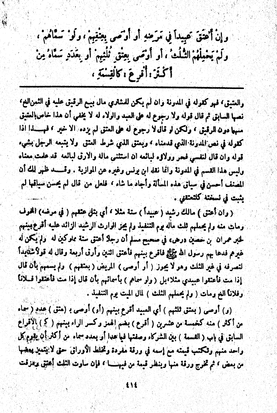 (وَإِنْ أَعْتَقَ) مَالِكٌ رَشِيدٌ (عَبِيدًا) سِتَّةً مَثَلًا، أَيْ بَتَلَ عِتْقَهُمْ (فِي مَرَضِهِ) الْمَخُوفِ وَمَاتَ مِنْهُ وَلَمْ يَحْمِلْهُمْ ثُلُثُ مَالِهِ يَوْمَ التَّنْفِيذِ وَلَمْ يُجِزْ الْوَارِثُ الرَّشِيدُ الزَّائِدُ عَلَيْهِ أُقْرِعَ بَيْنَهُمْ لِخَبَرِ عِمْرَانَ بْنِ حُصَيْنٍ " - رَضِيَ اللَّهُ عَنْهُ - " فِي صَحِيحِ مُسْلِمٍ أَنَّ «رَجُلًا أَعْتَقَ سِتَّةَ مَمْلُوكِينَ لَهُ وَلَمْ يَكُنْ لَهُ غَيْرُهُمْ فَدَعَا بِهِمْ رَسُولَ اللَّهِ - صَلَّى اللَّهُ عَلَيْهِ وَسَلَّمَ - فَأَقْرَعَ بَيْنَهُمْ فَأَعْتَقَ اثْنَيْنِ وَأَرَقَّ أَرْبَعَةً وَقَالَ لَهُ قَوْلًا شَدِيدًا لِتَصَرُّفِهِ فِي غَيْرِ الثُّلُثِ» وَهُوَ لَا يَجُوزُ (أَوْ أَوْصَى) الْمَرِيضُ (بِعِتْقِهِمْ) وَلَمْ يُسَمِّهِمْ بِأَنْ قَالَ إذَا مِتّ فَأَعْتِقُوا عَبِيدِي مَثَلًا، بَلْ (وَلَوْ سَمَّاهُمْ) بِأَسْمَائِهِمْ بِأَنْ قَالَ إذَا مِتّ فَأَعْتِقُوا فُلَانًا وَفُلَانًا إلَخْ وَمَاتَ (وَلَمْ يَحْمِلْهُمْ الثُّلُثُ) لِمَالِ الْمَيِّتِ يَوْمَ التَّنْفِيذِ.