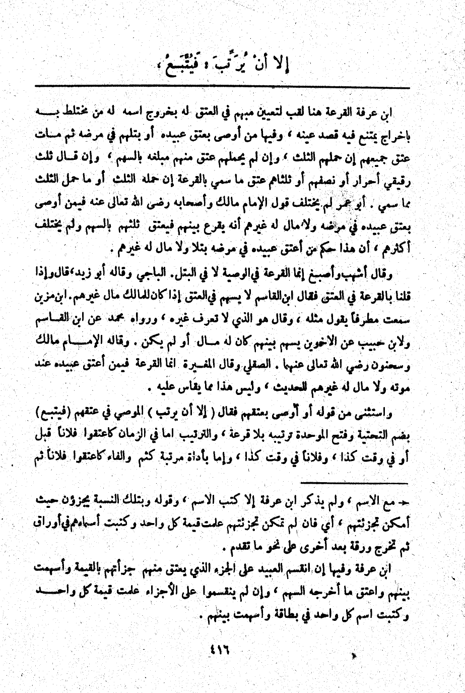 ـــــــــــــــــــــــــــــQابْنُ عَرَفَةَ الْقُرْعَةُ هُنَا لَقَبٌ لِتَعْيِينِ مُبْهَمٍ فِي الْعِتْقِ لَهُ بِخُرُوجِ اسْمِهِ لَهُ مِنْ مُخْتَلِطٍ بِهِ بِإِخْرَاجٍ يَمْتَنِعُ فِيهِ قَصْدُ عَيْنِهِ، وَفِيهَا مَنْ أَوْصَى بِعِتْقِ عَبِيدِهِ أَوْ بَتْلِهِمْ فِي مَرَضِهِ ثُمَّ مَاتَ عَتَقَ جَمِيعُهُمْ إنْ حَمَلَهُمْ الثُّلُثُ، وَإِنْ لَمْ يَحْمِلْهُمْ عَتَقَ مِنْهُمْ مَبْلَغُهُ بِالسَّهْمِ، وَإِنْ قَالَ ثُلُثُ رَقِيقِي أَحْرَارٌ أَوْ نِصْفُهُمْ أَوْ ثُلُثَاهُمْ عَتَقَ مَا سَمَّى بِالْقُرْعَةِ إنْ حَمَلَهُ الثُّلُثُ أَوْ مَا حَمَلَ الثُّلُثُ مِمَّا سَمَّى. أَبُو عُمَرَ لَمْ يَخْتَلِفْ قَوْلُ الْإِمَامِ مَالِكٍ وَأَصْحَابِهِ - رَضِيَ اللَّهُ تَعَالَى عَنْهُمْ - فِيمَنْ أَوْصَى بِعِتْقِ عَبِدِهِ فِي مَرَضِهِ وَلَا مَالَ لَهُ غَيْرُهُمْ أَنَّهُ يُقْرَعُ بَيْنَهُمْ فَيُعْتَقُ ثُلُثُهُمْ بِالسَّهْمِ وَلَمْ يَخْتَلِفْ أَكْثَرُهُمْ، أَنَّ هَذَا حُكْمُ مَنْ أَعْتَقَ عَبِيدَهُ فِي مَرَضِهِ بَتْلًا وَلَا مَالَ لَهُ غَيْرُهُمْ.