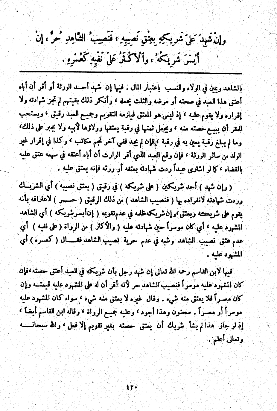 (وَإِنْ شَهِدَ) أَحَدُ شَرِيكَيْنِ (عَلَى شَرِيكِهِ) فِي رَقِيقٍ (بِعِتْقِ نَصِيبِهِ) أَيْ الشَّرِيكِ وَرُدَّتْ شَهَادَتُهُ لِانْفِرَادِهِ بِهَا (فَنَصِيبُ الشَّاهِدِ) مِنْ ذَلِكَ الرَّقِيقِ (حُرٌّ) لِاعْتِرَافِهِ بِأَنَّهُ يُقَوَّمُ عَلَى شَرِيكِهِ وَيُعْتَقُ، وَإِنَّ شَرِيكَهُ ظَلَمَهُ فِي عَدَمِ تَقْوِيمِهِ (إنْ أَيْسَرَ شَرِيكُهُ) أَيْ الشَّاهِدِ الْمَشْهُودِ عَلَيْهِ، أَيْ كَانَ مُوسِرًا حِينَ شَهَادَتِهِ عَلَيْهِ (وَالْأَكْثَرُ) مِنْ الرُّوَاةِ (عَلَى نَفْيِهِ) أَيْ عَدَمِ عِتْقِ نَصِيبِ الشَّاهِدِ وَشَبَّهَ فِي عَدَمِ حُرِّيَّةِ نَصِيبِ الشَّاهِدِ فَقَالَ (كَعُسْرِهِ) أَيْ الْمَشْهُودِ عَلَيْهِ.