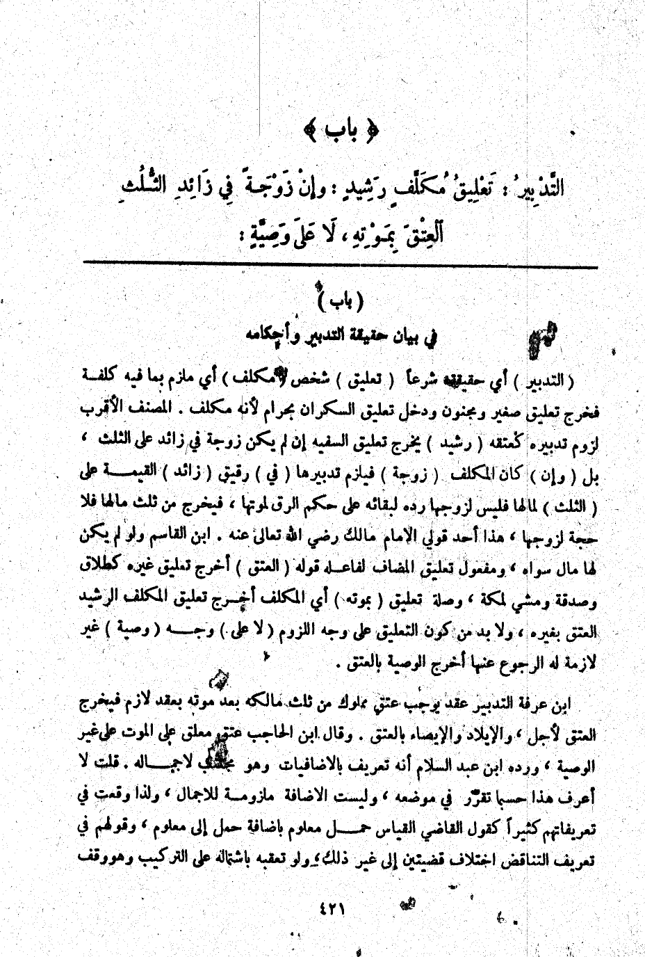 بَابٌ) التَّدْبِيرُ: تَعْلِيقُ مُكَلَّفٍ رَشِيدٍ وَإِنْ زَوْجَةً فِي زَائِدِ الثُّلُثِ الْعِتْقَ بِمَوْتِهِ، لَا عَلَى وَصِيَّةٍ