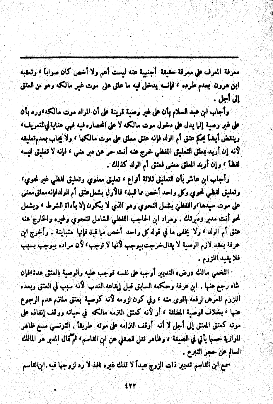 وَأَجَابَ ابْنُ عَبْدِ السَّلَامِ بِأَنَّ عَلَى غَيْرِ وَصِيَّةٍ قَرِينَةً عَلَى أَنَّ الْمُرَادَ مَوْتُ مَالِكِهِ، وَرُدَّ بِأَنَّ عَلَى غَيْرِ وَصِيَّةٍ إنَّمَا يَدُلُّ عَلَى دُخُولِ مَوْتِ مَالِكِهِ لَا عَلَى انْحِصَارِهِ فِيهِ فَهِيَ عِنَايَةٌ فِي التَّعْرِيفِ، وَيُنْقَضُ أَيْضًا بِحُكْمِ عِتْقِ أُمِّ الْوَلَدِ فَإِنَّهُ عِتْقٌ مُعَلَّقٌ عَلَى مَوْتِ مَالِكِهَا، وَلَا يُجَابُ بِعَدَمِ تَعْلِيقِهِ لِأَنَّهُ إنْ أُرِيدَ بِ " مُعَلَّقٌ " التَّعْلِيقُ اللَّفْظِيُّ خَرَجَ عَنْهُ أَنْتَ حُرٌّ عَنْ دُبُرٍ مِنِّي، فَإِنَّهُ لَا تَعْلِيقَ فِيهِ لَفْظًا، وَإِنْ أُرِيدَ الْمُعَلَّقُ مَعْنًى فَعِتْقُ أُمِّ الْوَلَدِ كَذَلِكَ.