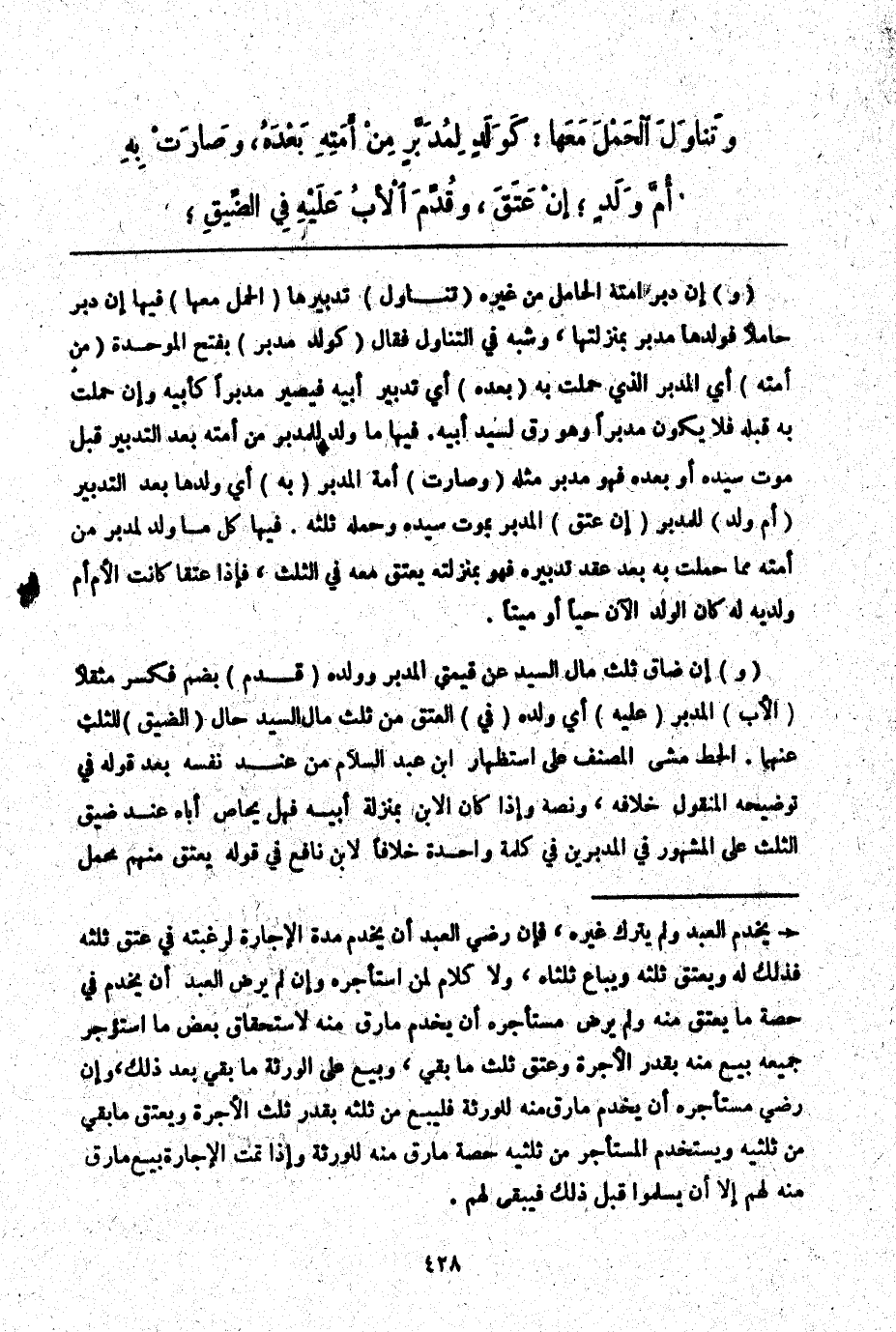 ـــــــــــــــــــــــــــــQوَ) إنْ دَبَّرَ أَمَتَهُ الْحَامِلَ مِنْ غَيْرِهِ (تَنَاوَلَ) تَدْبِيرُهَا (الْحَمْلَ مَعَهَا) فِيهَا إنْ دَبَّرَ حَامِلًا فَوَلَدُهَا مُدَبَّرٌ بِمَنْزِلَتِهَا، وَشَبَّهَ فِي التَّنَاوُلِ فَقَالَ (كَوَلَدٍ لِمُدَبَّرٍ) بِفَتْحِ الْمُوَحَّدَةِ (مِنْ أَمَتِهِ) أَيْ الْمُدَبَّرُ الَّذِي حَمَلَتْ بِهِ (بَعْدَهُ) أَيْ تَدْبِيرِ أَبِيهِ فَيَصِيرُ مُدَبَّرًا كَأَبِيهِ، وَإِنْ حَمَلَتْ بِهِ قَبْلَهُ فَلَا يَكُونُ مُدَبَّرًا، وَهُوَ رِقٌّ لِسَيِّدِ أَبِيهِ. فِيهَا مَا وُلِدَ لِلْمُدَبَّرِ مِنْ أَمَتِهِ بَعْدَ التَّدْبِيرِ قَبْلَ مَوْتِ سَيِّدِهِ أَوْ بَعْدَهُ فَهُوَ مُدَبَّرٌ مِثْلَهُ (وَصَارَتْ) أَمَةُ الْمُدَبَّرِ (بِهِ) أَيْ وَلَدُهَا بَعْدَ التَّدْبِيرِ (أُمَّ وَلَدٍ) لِلْمُدَبَّرِ (إنْ عَتَقَ) الْمُدَبَّرُ بِمَوْتِ سَيِّدِهِ، وَحَمَلَهُ ثُلُثُهُ. فِيهَا كُلُّ مَا وُلِدَ لِمُدَبَّرٍ مِنْ أَمَتِهِ مِمَّا حَمَلَتْ بِهِ بَعْدَ عَقْدِ تَدْبِيرِهِ فَهُوَ بِمَنْزِلَتِهِ يَعْتِقُ مَعَهُ فِي الثُّلُثِ، فَإِذَا عَتَقَا كَانَتْ الْأُمُّ أُمَّ وَلَدَيْهِ لَهُ كَانَ الْوَلَدُ الْآنَ حَيًّا أَوْ مَيِّتًا.