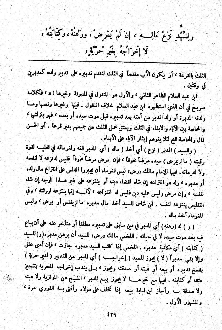 ـــــــــــــــــــــــــــــQالثُّلُثِ بِالْقُرْعَةِ، أَوْ يَكُونُ الْأَبُ مُقَدَّمًا فِي الثُّلُثِ لِتَقَدُّمِ تَدْبِيرِهِ عَلَى تَدْبِيرِ وَلَدِهِ كَمُدَبَّرَيْنِ فِي وَقْتَيْنِ. ابْنُ عَبْدِ السَّلَامِ الظَّاهِرُ الثَّانِي، وَالْأَوَّلُ هُوَ الْمَنْقُولُ فِي الْمُدَوَّنَةِ وَغَيْرِهَا. اهـ. فَكَلَامُهُ صَرِيحٌ فِي أَنَّ الَّذِي اسْتَظْهَرَهُ ابْنُ عَبْدِ السَّلَامِ خِلَافُ الْمَنْقُولِ. فِيهَا وَغَيْرِهَا وَنَصُّهَا وَمَا. وَلَدَتْهُ الْمُدَبَّرَةُ أَوْ وَلَدُ الْمُدَبَّرِ مِنْ أَمَتِهِ بَعْدَ تَدْبِيرِهِ قَبْلَ مَوْتِ سَيِّدِهِ أَوْ بَعْدَهُ، فَهُوَ بِمَنْزِلَتِهِمَا، وَالْمُحَاصَّةُ بَيْنَ الْآبَاءِ وَالْأَبْنَاءِ فِي الثُّلُثِ وَيَعْتِقُ مَحْمِلُ الثُّلُثِ مِنْ جَمِيعِهِمْ بِغَيْرِ قُرْعَةٍ. أَبُو الْحَسَنِ قَالَ: وَالْمُحَاصَّةُ إلَخْ لِئَلَّا يُتَوَهَّمَ إيثَارُ الْآبَاءِ عَلَى الْأَبْنَاءِ.