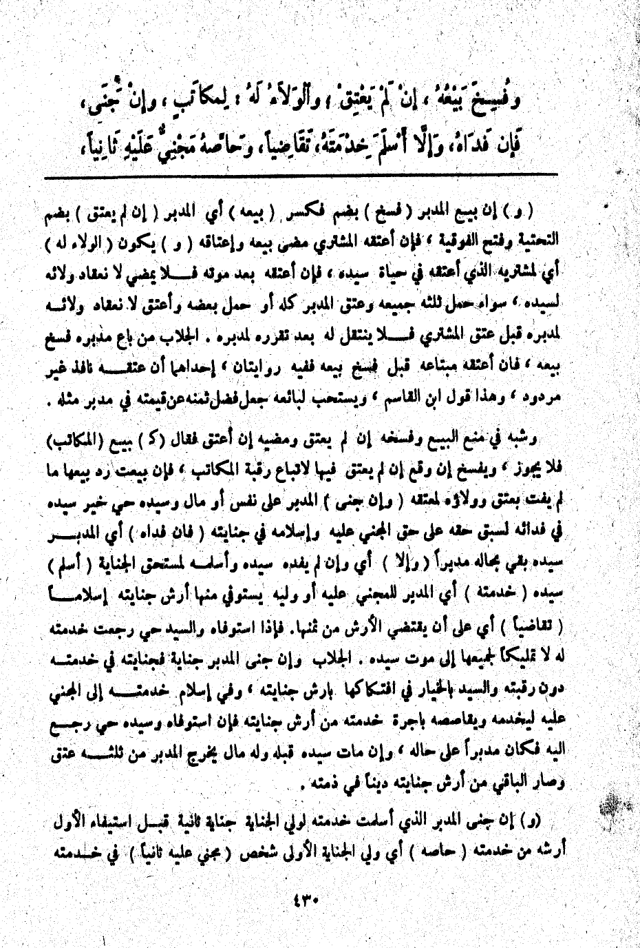 ـــــــــــــــــــــــــــــQ (وَ) إنْ بِيعَ الْمُدَبَّرُ (فُسِخَ) بِضَمٍّ فَكَسْرٍ (بَيْعُهُ) أَيْ الْمُدَبَّرِ (إنْ لَمْ يُعْتَقْ) بِضَمِّ التَّحْتِيَّةِ وَفَتْحِ الْفَوْقِيَّةِ، فَإِنْ أَعْتَقَهُ الْمُشْتَرِي مَضَى بَيْعُهُ وَإِعْتَاقُهُ (وَ) يَكُونُ (الْوَلَاءُ لَهُ) أَيْ لِمُشْتَرِيهِ الَّذِي أَعْتَقَهُ فِي حَيَاةِ سَيِّدِهِ، فَإِنْ أَعْتَقَهُ بَعْدَ مَوْتِهِ فَلَا يَمْضِي لِانْعِقَادِ وَلَائِهِ لِسَيِّدِهِ، سَوَاءٌ حَمَلَ ثُلُثُهُ جَمِيعَهُ وَعَتَقَ الْمُدَبَّرُ كُلُّهُ أَوْ حَمَلَ بَعْضَهُ، وَأَعْتَقَ لِانْعِقَادِ وَلَائِهِ لِمُدَبِّرِهِ قَبْلَ عِتْقِ الْمُشْتَرِي فَلَا يَنْتَقِلُ لَهُ بَعْدَ تَقَرُّرِهِ لِمُدَبِّرِهِ. الْجَلَّابُ مَنْ بَاعَ مُدَبَّرَهُ فُسِخَ بَيْعُهُ، فَإِنْ أَعْتَقَهُ مُبْتَاعُهُ قَبْلَ فَسْخِ بَيْعِهِ فَفِيهِ رِوَايَتَانِ، إحْدَاهُمَا: أَنَّ عِتْقَهُ نَافِذٌ غَيْرُ مَرْدُودٍ، وَهَذَا قَوْلُ ابْنِ الْقَاسِمِ، وَيُسْتَحَبُّ لِبَائِعِهِ جَعْلُ فَضْلِ ثَمَنِهِ عَنْ قِيمَتِهِ فِي مُدَبَّرٍ مِثْلِهِ. وَشَبَّهَ فِي مَنْعِ الْبَيْعِ وَفَسْخِهِ إنْ لَمْ يُعْتَقْ وَمُضِيِّهِ إنْ أَعْتَقَ فَقَالَ (كَ) بَيْعِ (الْمُكَاتَبِ) فَلَا يَجُوزُ، وَيُفْسَخُ إنْ وَقَعَ إنْ لَمْ يُعْتَقْ فِيهَا لِاتِّبَاعِ رَقَبَةِ الْمُكَاتَبِ، فَإِنْ بِيعَتْ رُدَّ بَيْعُهَا مَا لَمْ يَفُتْ بِعِتْقٍ، وَوَلَاؤُهُ لِمُعْتَقِهِ