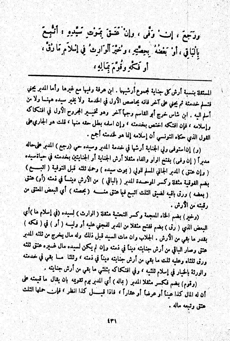 (وَخُيِّرَ) بِضَمِّ الْخَاءِ الْمُعْجَمَةِ وَكَسْرِ التَّحْتِيَّةِ مُثَقَّلَةً (الْوَارِثُ) لِسَيِّدِهِ (فِي إسْلَامِ مَا) أَيْ الْبَعْضِ الَّذِي (رُقَّ) بِضَمٍّ فَفَتْحٍ مُثَقَّلًا مِنْ الْمُدَبَّرِ لِلْمَجْنِيِّ عَلَيْهِ أَوْ وَلِيِّهِ (أَوْ) فِي (فَكِّهِ) بِقَدْرِ مَا بَقِيَ مِنْ الْأَرْشِ. الْجَلَّابُ وَإِنْ مَاتَ السَّيِّدُ قَبْلَ ذَلِكَ وَلَهُ مَالٌ يَخْرُجُ مِنْ ثُلُثِهِ الْمُدَبَّرُ عَتَقَ وَصَارَ الْبَاقِي مِنْ أَرْشِ جِنَايَتِهِ دَيْنًا فِي ذِمَّتِهِ، وَإِنْ لَمْ يَكُنْ لِسَيِّدِهِ مَالٌ غَيْرُهُ عَتَقَ ثُلُثُهُ وَرُقَّ ثُلُثَاهُ وَعَلَيْهِ ثُلُثُ مَا بَقِيَ مِنْ أَرْشِ جِنَايَتِهِ دَيْنًا فِي ذِمَّتِهِ، وَثُلُثُ مَا بَقِيَ فِي خِدْمَتِهِ، وَالْوَرَثَةُ بِالْخِيَارِ فِي إسْلَامِ ثُلُثَيْهِ، وَفِي افْتِكَاكِهِ بِثُلُثَيْ مَا بَقِيَ مِنْ أَرْشِ جِنَايَتِهِ.