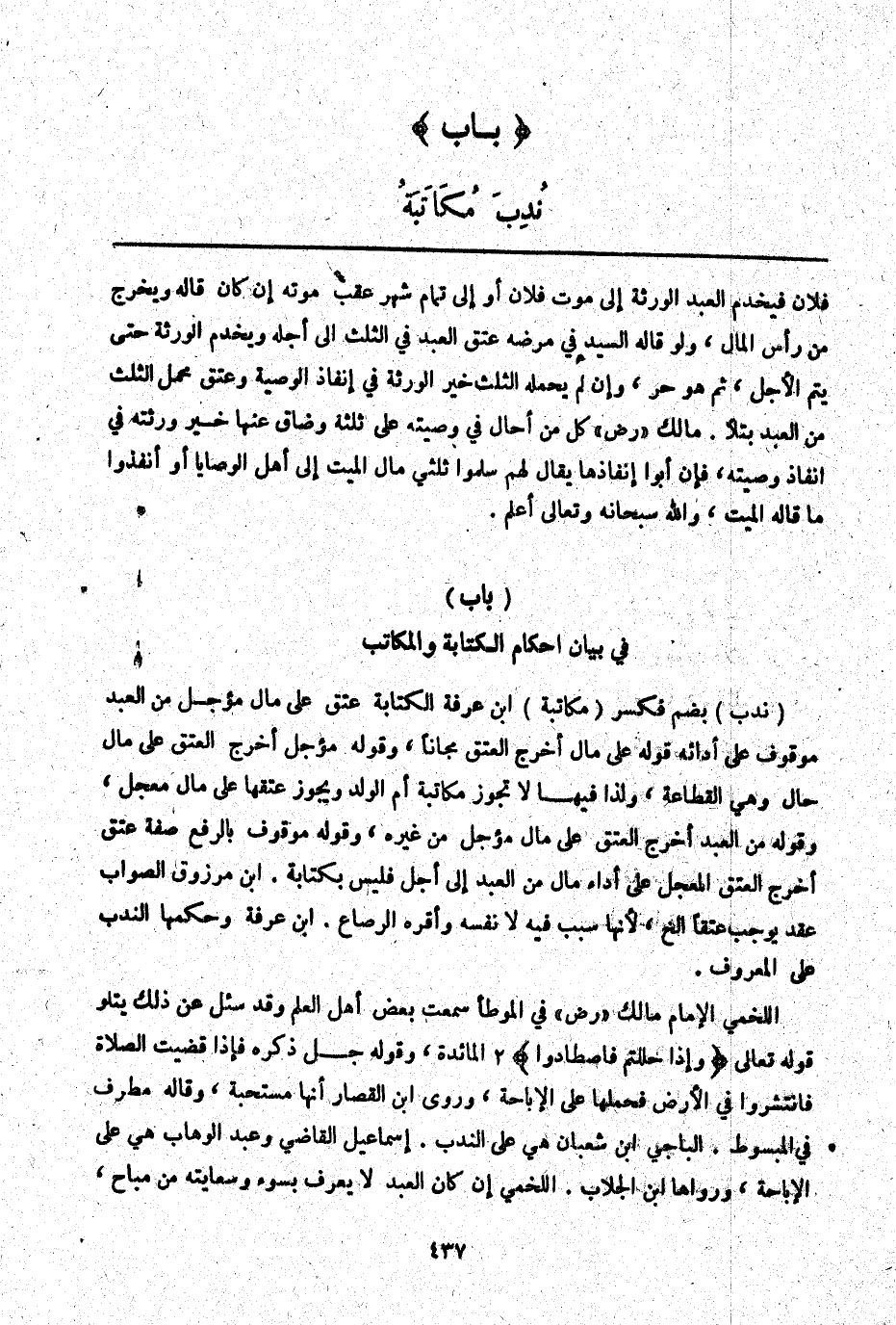 (بَابٌ) فِي بَيَانِ أَحْكَامِ الْكِتَابَةِ وَالْمُكَاتَبِ (نُدِبَ) بِضَمٍّ فَكَسْرٍ (مُكَاتَبَةُ) ابْنُ عَرَفَةَ الْكِتَابَةُ عِتْقٌ عَلَى مَالٍ مُؤَجَّلٍ مِنْ الْعَبْدِ مَوْقُوفٌ عَلَى أَدَائِهِ قَوْلُهُ عَلَى مَالٍ أَخْرَجَ الْعِتْقَ مَجَّانًا