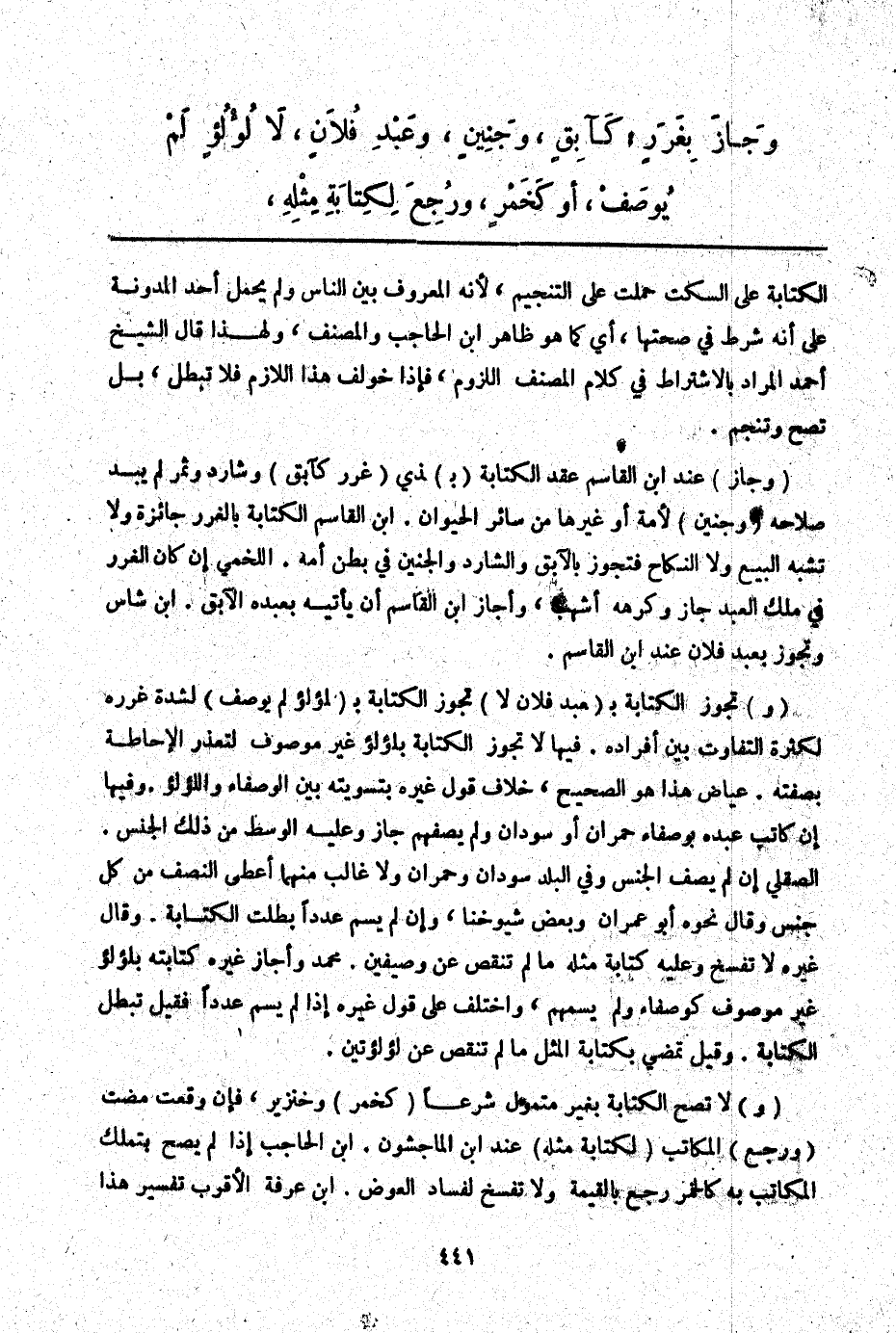 (وَ) تَجُوزُ الْكِتَابَةُ بِ (عَبْدِ فُلَانٍ لَا) تَجُوزُ الْكِتَابَةُ بِ (لُؤْلُؤٍ لَمْ يُوصَفْ) لِشِدَّةِ غَرَرِهِ لِكَثْرَةِ التَّفَاوُتِ بَيْنَ أَفْرَادِهِ. فِيهَا لَا تَجُوزُ الْكِتَابَةُ بِلُؤْلُؤٍ غَيْرِ مَوْصُوفٍ لِتَعَذُّرِ الْإِحَاطَةِ بِصِفَتِهِ. عِيَاضٌ هَذَا هُوَ الصَّحِيحُ، خِلَافُ قَوْلِ غَيْرِهِ بِتَسْوِيَتِهِ بَيْنَ الْوُصَفَاءِ وَاللُّؤْلُؤِ. وَفِيهَا إنْ كَاتَبَ عَبْدَهُ بِوُصَفَاءَ حُمْرَانَ أَوْ سُودَانَ وَلَمْ يَصِفْهُمْ جَازَ وَعَلَيْهِ الْوَسَطُ مِنْ ذَلِكَ الْجِنْسِ. الصِّقِلِّيُّ إنْ لَمْ يَصِفْ الْجِنْسَ وَفِي الْبَلَدِ سُودَانُ وَحُمْرَانُ وَلَا غَالِبَ مِنْهُمَا أَعْطَى النِّصْفَ مِنْ كُلِّ جِنْسٍ وَقَالَ نَحْوَهُ أَبُو عِمْرَانَ وَبَعْضُ شُيُوخِنَا، وَإِنْ لَمْ يُسَمِّ عَدَدًا بَطَلَتْ الْكِتَابَةُ. وَقَالَ غَيْرُهُ: لَا تُفْسَخُ، وَعَلَيْهِ كِتَابَةُ مِثْلِهِ مَا لَمْ تَنْقُصْ عَنْ وَصْفَيْنِ. مُحَمَّدٌ وَأَجَازَ غَيْرُهُ كِتَابَتَهُ بِلُؤْلُؤٍ غَيْرِ مَوْصُوفٍ كَوُصَفَاءَ وَلَمْ يُسَمِّهِمْ، وَاخْتُلِفَ عَلَى قَوْلِ غَيْرِهِ إذَا لَمْ يُسَمِّ عَدَدًا فَقِيلَ تَبْطُلُ الْكِتَابَةُ. وَقِيلَ: تَمْضِي بِكِتَابَةِ الْمِثْلِ مَا لَمْ تَنْقُصُ عَنْ لُؤْلُؤَتَيْنِ.