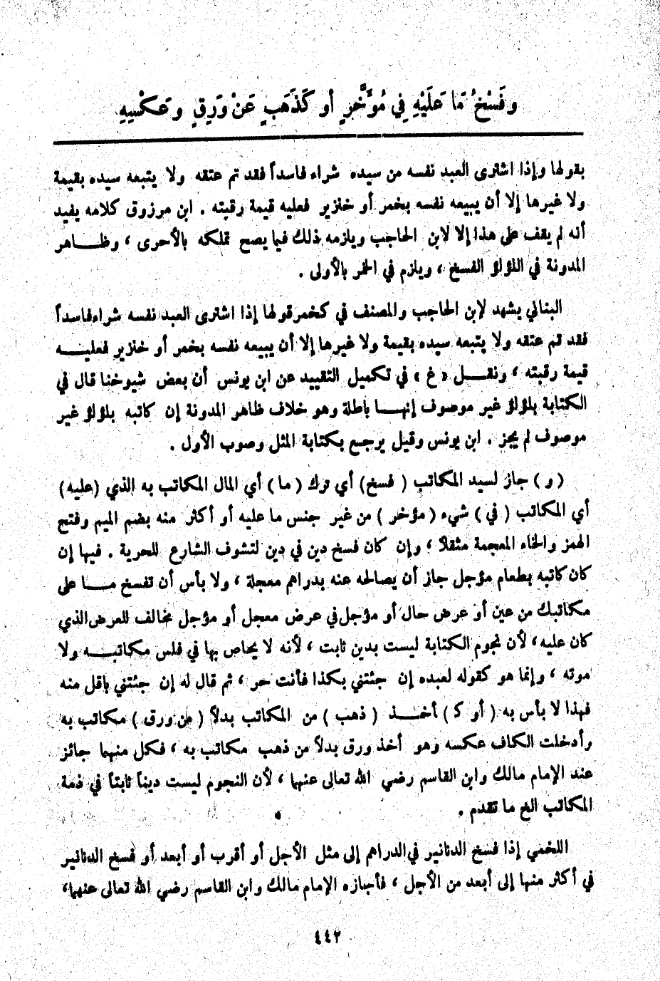 ـــــــــــــــــــــــــــــQبِقَوْلِهَا: وَإِذَا اشْتَرَى الْعَبْدُ نَفْسَهُ مِنْ سَيِّدِهِ شِرَاءً فَاسِدًا فَقَدْ تَمَّ عِتْقُهُ وَلَا يَتْبَعُهُ سَيِّدُهُ بِقِيمَةٍ وَلَا غَيْرِهَا إلَّا أَنْ يَبِيعَهُ نَفْسَهُ بِخَمْرٍ أَوْ خِنْزِيرٍ فَعَلَيْهِ قِيمَةُ رَقَبَتِهِ. ابْنُ مَرْزُوقٍ كَلَامُهُ يُفِيدُ أَنَّهُ لَمْ يَقِفْ عَلَى هَذَا إلَّا لِابْنِ الْحَاجِبِ وَيَلْزَمُهُ ذَلِكَ فِيمَا يَصِحُّ تَمَلُّكُهُ بِالْأَحْرَى وَظَاهِرُ الْمُدَوَّنَةِ فِي اللُّؤْلُؤِ الْفَسْخُ، وَيَلْزَمُ فِي الْخَمْرِ بِالْأَوْلَى. الْبُنَانِيُّ يَشْهَدُ لِابْنِ الْحَاجِبِ وَالْمُصَنِّفِ فِي كَخَمْرٍ قَوْلُهَا: إذَا اشْتَرَى الْعَبْدُ نَفْسَهُ شِرَاءً فَاسِدًا فَقَدْ تَمَّ عِتْقُهُ، وَلَا يَتْبَعُهُ سَيِّدُهُ بِقِيمَةٍ، وَلَا غَيْرِهَا إلَّا أَنْ يَبِيعَهُ نَفْسَهُ بِخَمْرٍ أَوْ خِنْزِيرٍ فَعَلَيْهِ قِيمَةُ رَقَبَتِهِ، وَنَقَلَ " غ " فِي تَكْمِيلِ التَّقْيِيدِ عَنْ ابْنِ يُونُسَ أَنَّ بَعْضَ شُيُوخِنَا قَالَ فِي الْكِتَابَةِ بِلُؤْلُؤٍ غَيْرِ مَوْصُوفٍ: إنَّهَا بَاطِلَةٌ، وَهُوَ خِلَافُ ظَاهِرِ الْمُدَوَّنَةِ إنْ كَاتَبَهُ بِلُؤْلُؤٍ غَيْرِ مَوْصُوفٍ لَمْ يَجُزْ. ابْنُ يُونُسَ، وَقِيلَ: يَرْجِعُ بِكِتَابَةِ الْمِثْلِ وَصَوَّبَ الْأَوَّلَ.