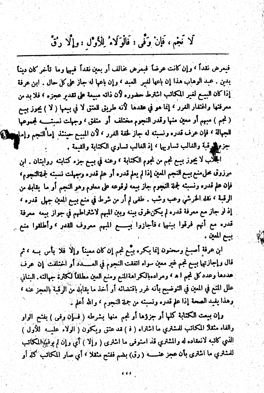 ثُمَّ قَالَ: وَإِجَازَتُهُمَا بَيْعَ نَجْمٍ غَيْرِ مُعَيَّنٍ سَوَاءٌ اتَّفَقَتْ النُّجُومُ فِي الْعَدَدِ أَوْ اخْتَلَفَتْ إنْ عُرِفَ عَدَدُهَا وَعَدَدُ كُلِّ نَجْمٍ اهـ وَمُرَادُهُ بِالْكَرَاهَةِ الْمَنْعُ، وَمَنْعُ الْعَيْنِ مُطْلَقًا لِكَثْرَةِ جَهَالَتِهِ. الْبُنَانِيُّ عَلَّلَ الْمَنْعَ فِي الْمُعَيَّنِ فِي التَّوْضِيحِ بِأَنَّهُ غَرَرٌ بِاقْتِضَائِهِ أَوْ أَخْذِ مَا يُقَابِلُهُ مِنْ الرَّقَبَةِ بِالْعَجْزِ عَنْهُ، وَهَذَا يُفِيدُ الصِّحَّةَ إذَا عُلِمَ قَدْرُهُ وَنِسْبَتُهُ مِنْ جُمْلَةِ النُّجُومِ، وَاَللَّهُ أَعْلَمُ. وَإِنْ بِيعَتْ الْكِتَابَةُ كُلُّهَا أَوْ جُزْؤُهَا أَوْ نَجْمٌ مِنْهَا بِشَرْطِهِ (فَإِنْ وَفَّى) بِفَتْحِ الْوَاوِ وَالْفَاءِ مُثَقَّلًا الْمُكَاتَبُ لِلْمُشْتَرِي مَا اشْتَرَاهُ (فَ) قَدْ عَتَقَ وَيَكُونُ (الْوَلَاءُ عَلَيْهِ لِلْأَوَّلِ) الَّذِي كَاتَبَهُ لِانْعِقَادِهِ لَهُ وَالْمُشْتَرِي قَدْ اسْتَوْفَى مَا اشْتَرَى (وَإِلَّا) أَيْ وَإِنْ لَمْ يُوَفِّ الْمُكَاتَبُ لِلْمُشْتَرِي مَا اشْتَرَى بِأَنْ عَجَزَ عَنْهُ (رُقَّ) بِضَمٍّ فَفَتْحٍ مُثَقَّلًا، أَيْ صَارَ الْمُكَاتَبُ كُلُّهُ أَوْ