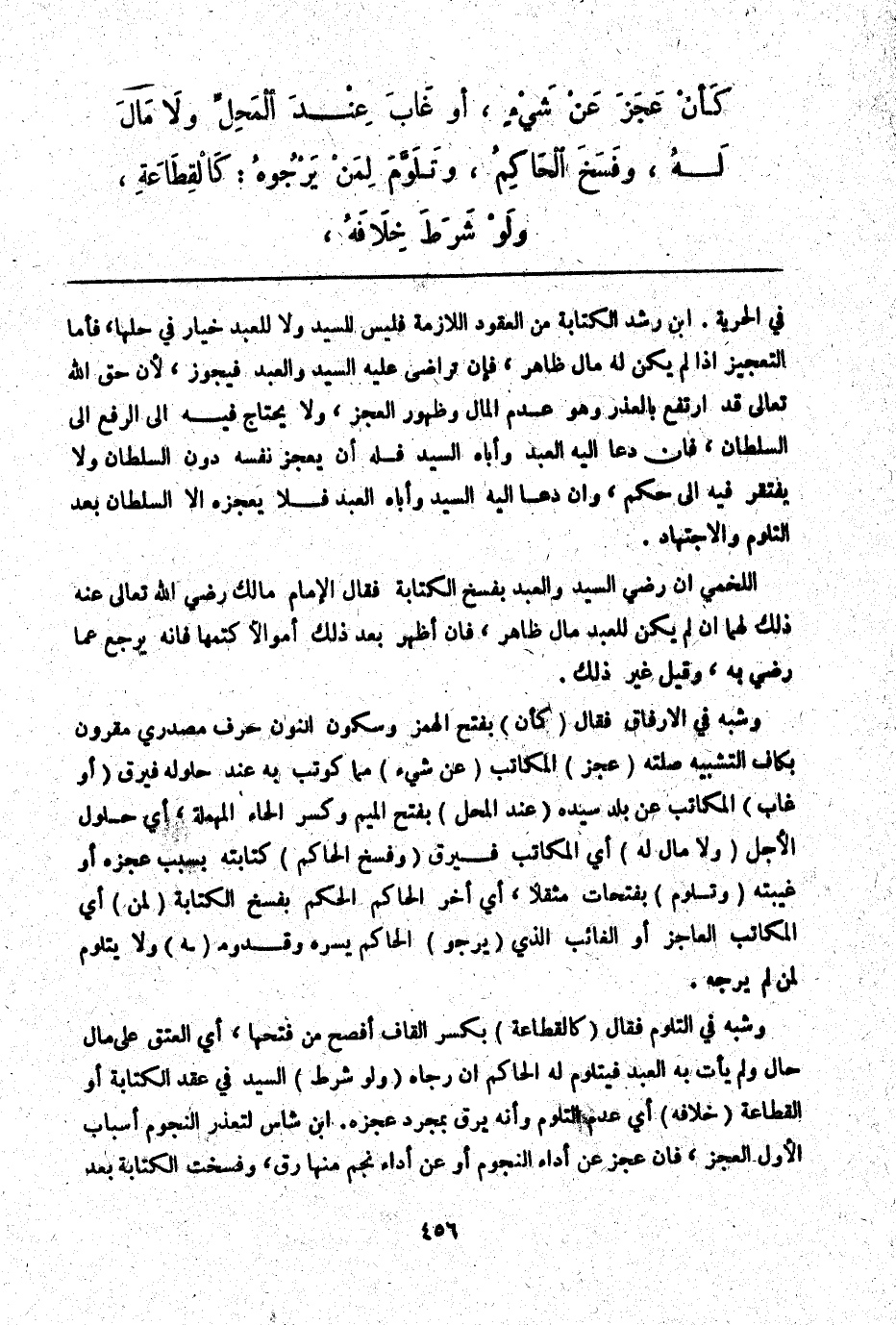 وَشَبَّهَ فِي التَّلَوُّمِ فَقَالَ (كَالْقِطَاعَةِ) بِكَسْرِ الْقَافِ أَفْصَحُ مِنْ فَتْحِهَا، أَيْ الْعِتْقِ عَلَى مَالٍ حَالٍّ وَلَمْ يَأْتِ بِهِ الْعَبْدُ فَيَتَلَوَّمُ لَهُ الْحَاكِمُ إنْ رَجَاهُ (وَلَوْ شَرَطَ) السَّيِّدُ فِي عَقْدِ الْكِتَابَةِ أَوْ الْقِطَاعَةِ (خِلَافَهُ) أَيْ عَدَمَ التَّلَوُّمِ وَأَنَّهُ يُرَقُّ بِمُجَرَّدِ عَجْزِهِ. ابْنُ شَاسٍ لِتَعَذُّرِ النُّجُومِ أَسْبَابٌ: الْأَوَّلُ: الْعَجْزُ، فَإِنْ عَجَزَ عَنْ أَدَاءِ النُّجُومِ أَوْ عَنْ أَدَاءِ نَجْمٍ مِنْهَا رُقَّ، وَفُسِخَتْ الْكِتَابَةُ بَعْدَ