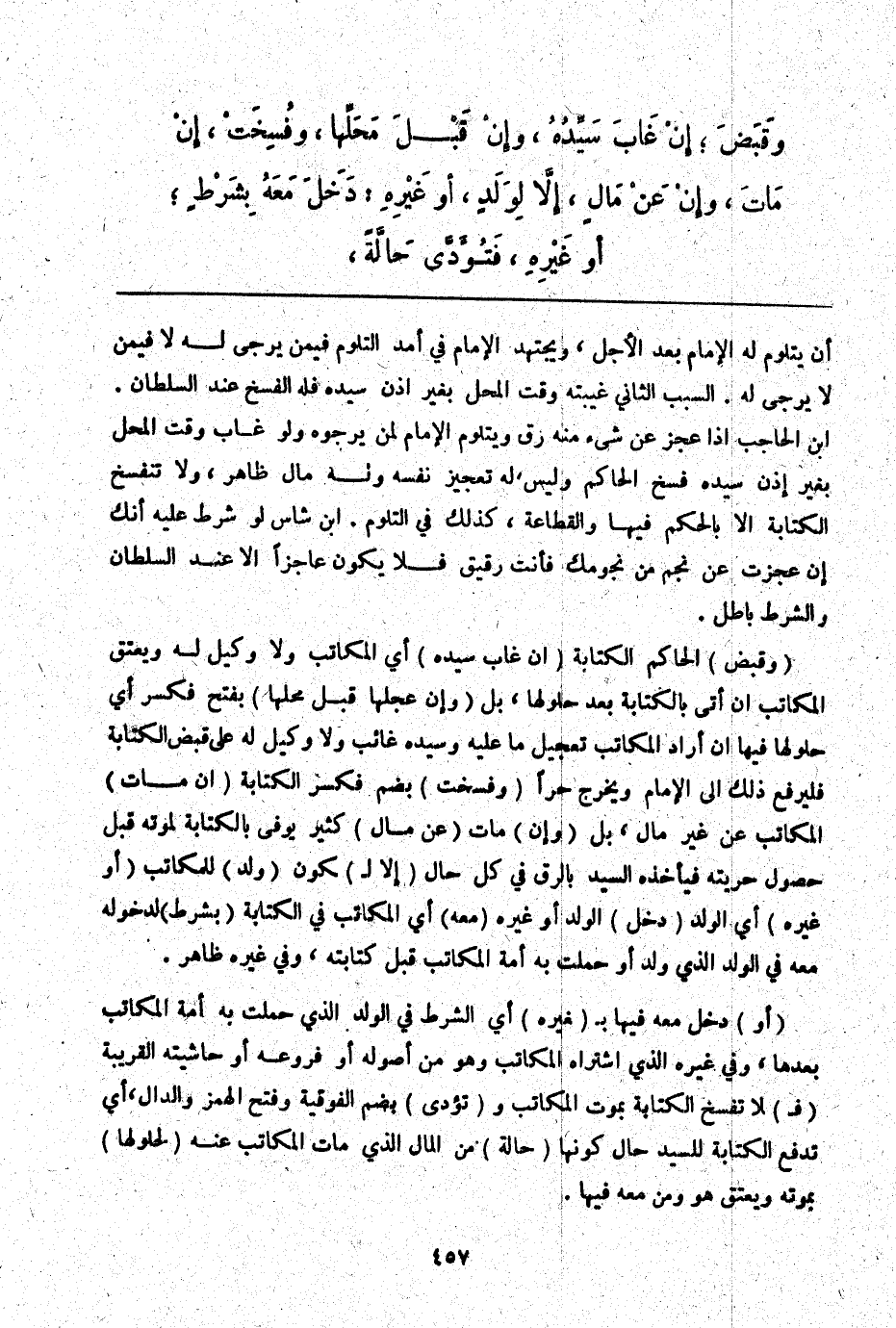 السَّبَبُ الثَّانِي: غَيْبَتُهُ وَقْتَ الْمَحِلِّ بِغَيْرِ إذْنِ سَيِّدِهِ فَلَهُ الْفَسْخُ عِنْدَ السُّلْطَانِ. ابْنُ الْحَاجِبِ إذَا عَجَزَ عَنْ شَيْءٍ مِنْهُ رُقَّ وَيَتَلَوَّمُ الْإِمَامُ لِمَنْ يَرْجُوهُ وَلَوْ غَابَ وَقْتَ الْمَحِلِّ بِغَيْرِ إذْنِ سَيِّدِهِ فَسَخَ الْحَاكِمُ وَلَيْسَ لَهُ تَعْجِيزُ نَفْسِهِ، وَلَهُ مَالٌ ظَاهِرٌ، وَلَا تَنْفَسِخُ الْكِتَابَةُ إلَّا بِالْحُكْمِ فِيهَا وَالْقِطَاعَةُ كَذَلِكَ فِي التَّلَوُّمِ. ابْنُ شَاسٍ لَوْ شَرَطَ عَلَيْهِ أَنَّك إنْ عَجَزْت عَنْ نَجْمٍ مِنْ نُجُومِك فَأَنْتَ رَقِيقٌ فَلَا يَكُونُ عَاجِزًا إلَّا عِنْدَ السُّلْطَانِ وَالشَّرْطُ بَاطِلٌ.