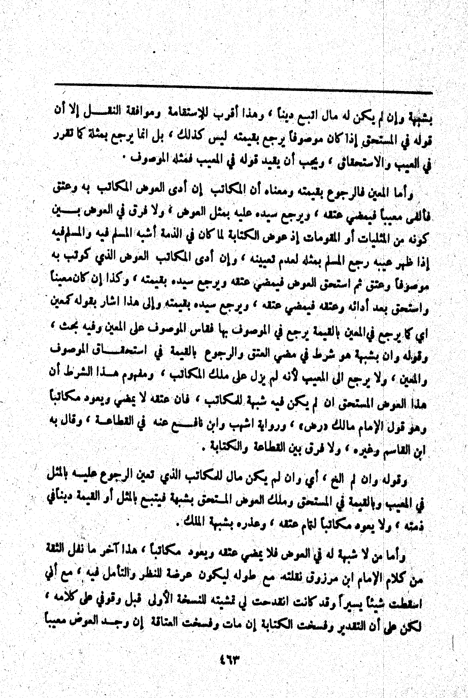 وَأَمَّا مَنْ لَا شُبْهَةَ لَهُ فِي الْعِوَضِ فَلَا يَمْضِي عِتْقُهُ وَيَعُودُ مُكَاتَبًا، هَذَا آخِرُ مَا نَقَلَ الثِّقَةُ مِنْ كَلَامِ الْإِمَامِ ابْنِ مَرْزُوقٍ نَقَلْته مَعَ طُولِهِ لِيَكُونَ عُرْضَةً لِلنَّظَرِ وَالتَّأَمُّلِ فِيهِ، مَعَ أَنِّي أَسْقَطْت شَيْئًا يَسِيرًا وَقَدْ كَانَتْ انْقَدَحَتْ لِي تَمْشِيَتُهُ لِلنُّسْخَةِ الْأُولَى قَبْلَ وُقُوفِي عَلَى كَلَامِهِ، لَكِنْ عَلَى أَنَّ التَّقْدِيرَ وَفُسِخَتْ الْكِتَابَةُ إنْ مَاتَ وَفُسِخَتْ الْعَتَاقَةُ إنْ وُجِدَ الْعِوَضُ مَعِيبًا