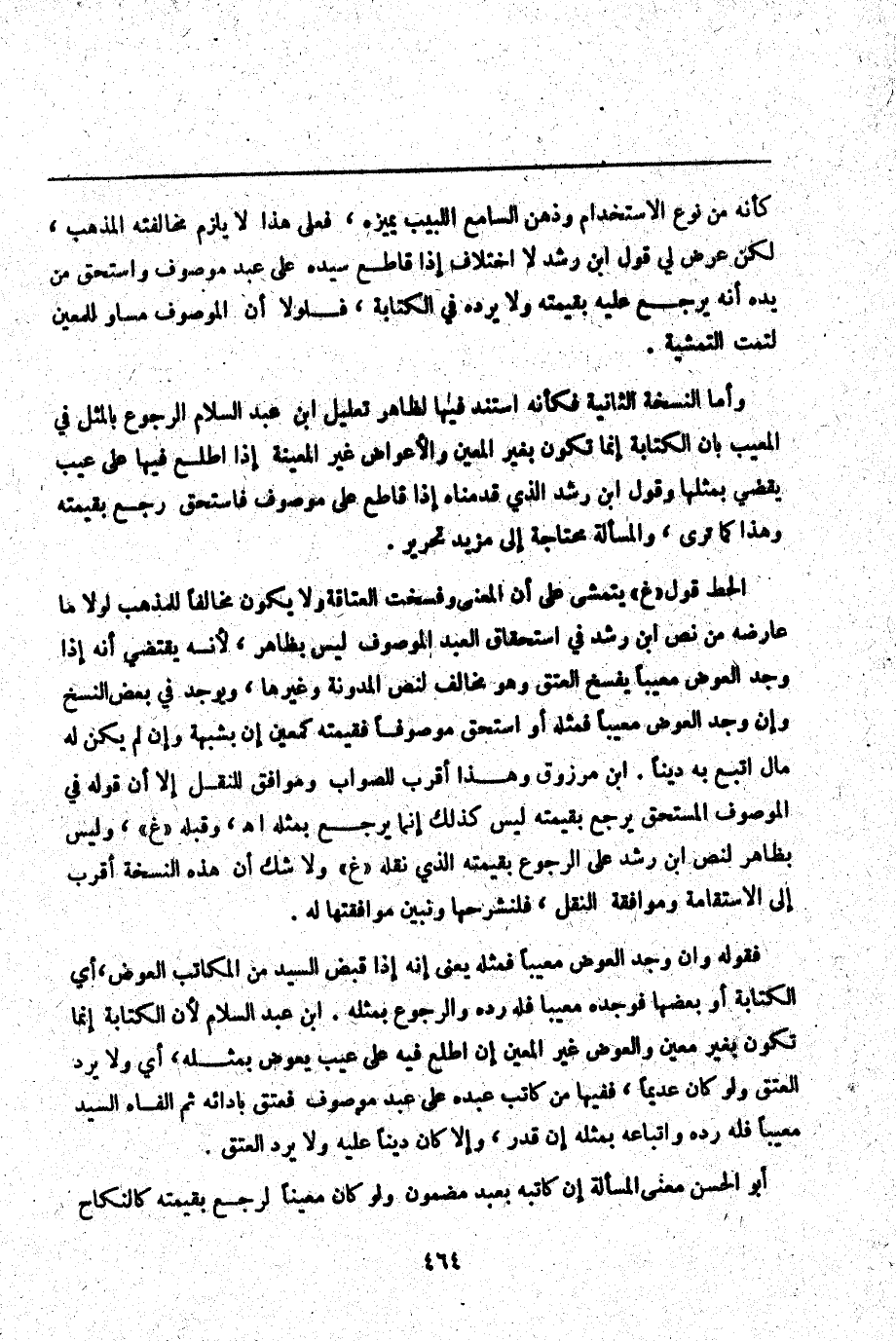 ـــــــــــــــــــــــــــــQكَأَنَّهُ مِنْ نَوْعِ الِاسْتِخْدَامِ وَذِهْنُ السَّامِعِ اللَّبِيبِ يُمَيِّزُهُ، فَعَلَى هَذَا لَا يَلْزَمُ مُخَالَفَتُهُ الْمَذْهَبَ، لَكِنْ عَرَضَ لِي قَوْلُ ابْنِ رُشْدٍ لَا اخْتِلَافَ إذَا قَاطَعَ سَيِّدَهُ عَلَى عَبْدٍ مَوْصُوفٍ وَاسْتُحِقَّ مِنْ يَدِهِ أَنَّهُ يَرْجِعُ عَلَيْهِ بِقِيمَتِهِ وَلَا يَرُدُّهُ فِي الْكِتَابَةِ، فَلَوْلَا أَنَّ الْمَوْصُوفَ مُسَاوٍ لِلْمُعَيَّنِ لَتَمَّتْ التَّمْشِيَةُ. وَأَمَّا النُّسْخَةُ الثَّانِيَةُ فَكَأَنَّهُ اسْتَنَدَ فِيهَا لِظَاهِرِ تَعْلِيلِ ابْنِ عَبْدِ السَّلَامِ الرُّجُوعَ بِالْمِثْلِ فِي الْمَعِيبِ بِأَنَّ الْكِتَابَةَ إنَّمَا تَكُونُ بِغَيْرِ الْمُعَيَّنِ وَالْأَعْوَاضِ غَيْرِ الْمُعَيَّنَةِ إذَا اطَّلَعَ فِيهَا عَلَى عَيْبٍ يَقْضِي بِمِثْلِهَا، وَقَوْلُ ابْنِ رُشْدٍ الَّذِي قَدَّمْنَاهُ إذَا قَاطَعَ عَلَى مَوْصُوفٍ فَاسْتُحِقَّ رَجَعَ بِقِيمَتِهِ وَهَذَا كَمَا تَرَى، وَالْمَسْأَلَةُ مُحْتَاجَةٌ إلَى مَزِيدِ تَحْرِيرٍ.