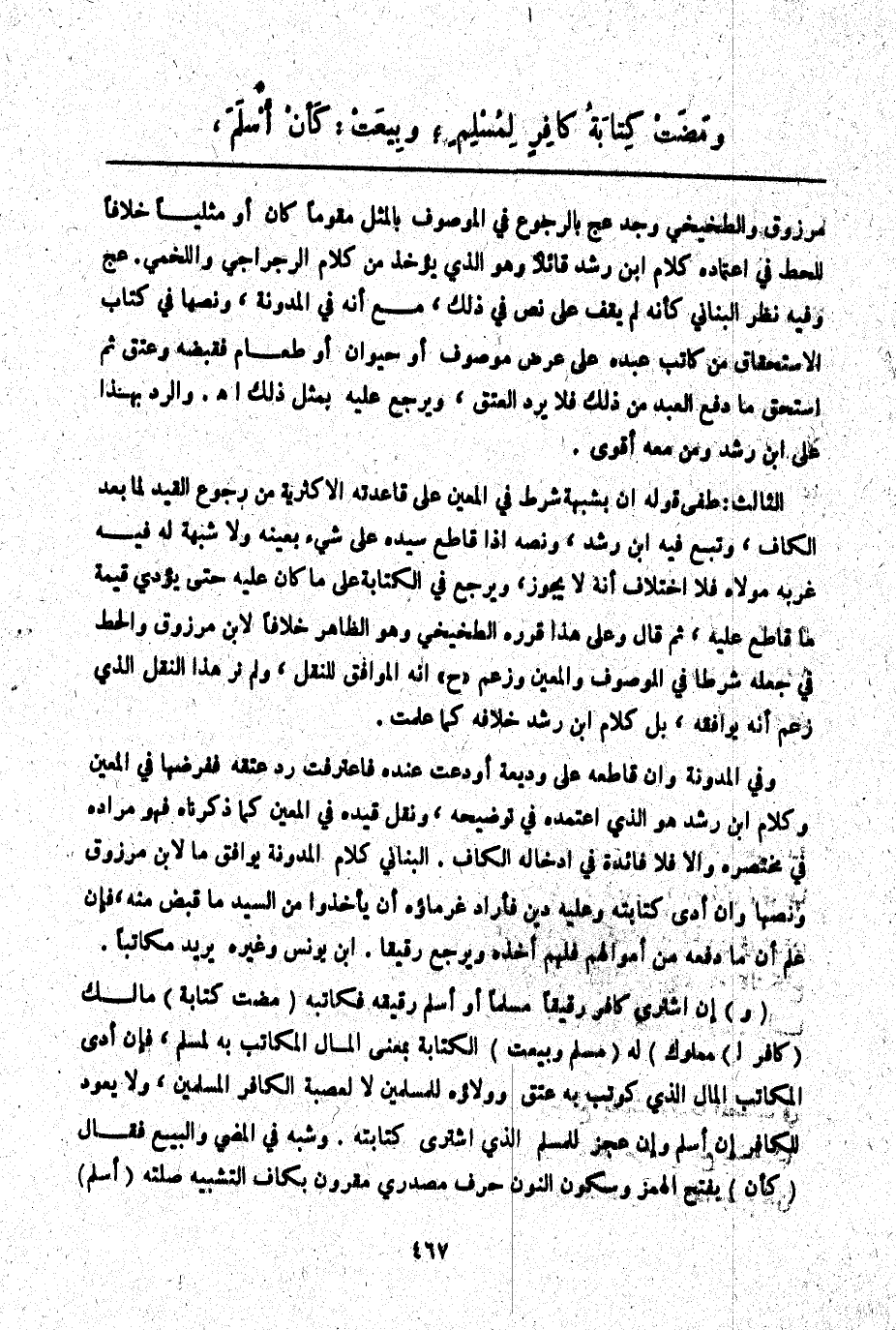 الثَّالِثُ: طفي قَوْلُهُ إنْ بِشُبْهَةٍ شَرْطٌ فِي الْمُعَيَّنِ عَلَى قَاعِدَتِهِ الْأَكْثَرِيَّةِ مِنْ رُجُوعِ الْقَيْدِ لِمَا بَعْدَ الْكَافِ، وَتَبِعَ فِيهِ ابْنَ رُشْدٍ، وَنَصُّهُ إذَا قَاطَعَ سَيِّدَهُ عَلَى شَيْءٍ بِعَيْنِهِ، وَلَا شُبْهَةَ لَهُ فِيهِ غَرَّبَهُ مَوْلَاهُ فَلَا اخْتِلَافَ أَنَّهُ لَا يَجُوزُ، وَيَرْجِعُ فِي الْكِتَابَةِ عَلَى مَا كَانَ عَلَيْهِ حَتَّى يُؤَدِّيَ قِيمَةَ مَا قَاطَعَ عَلَيْهِ، ثُمَّ قَالَ: وَعَلَى هَذَا قَرَّرَهُ الطِّخِّيخِيُّ وَهُوَ الظَّاهِرُ خِلَافًا لِابْنِ مَرْزُوقٍ وَالْحَطّ فِي جَعْلِهِ شَرْطًا فِي الْمَوْصُوفِ وَالْمُعَيَّنِ وَزَعَمَ " ح " أَنَّهُ الْمُوَافِقُ لِلنَّقْلِ، وَلَمْ نَرَ هَذَا النَّقْلَ الَّذِي زَعَمَ أَنَّهُ يُوَافِقُهُ، بَلْ كَلَامُ ابْنِ رُشْدٍ خِلَافُهُ كَمَا عَلِمْت. وَفِي الْمُدَوَّنَةِ: وَإِنْ قَاطَعَهُ عَلَى وَدِيعَةٍ أُودِعَتْ عِنْدَهُ فَاعْتُرِفَتْ رُدَّ عِتْقُهُ فَفَرْضُهَا فِي الْمُعَيَّنِ، وَكَلَامُ ابْنِ رُشْدٍ هُوَ الَّذِي اعْتَمَدَهُ فِي تَوْضِيحِهِ، وَنَقَلَ قَيْدَهُ فِي الْمُعَيَّنِ كَمَا ذَكَرْنَاهُ فَهُوَ مُرَادُهُ فِي مُخْتَصَرِهِ وَإِلَّا فَلَا فَائِدَةَ فِي إدْخَالِهِ الْكَافَ. الْبُنَانِيُّ كَلَامُ الْمُدَوَّنَةِ يُوَافِقُ مَا لِابْنِ مَرْزُوقٍ وَنَصُّهَا وَإِنْ أَدَّى كِتَابَتَهُ، وَعَلَيْهِ دَيْنٌ فَأَرَادَ غُرَمَاؤُهُ أَنْ يَأْخُذُوا مِنْ السَّيِّدِ مَا قَبَضَ مِنْهُ، فَإِنْ عَلِمَ أَنَّ مَا دَفَعَهُ مِنْ أَمْوَالِهِمْ فَلَهُمْ أَخْذُهُ، وَيَرْجِعُ رَقِيقًا. ابْنُ يُونُسَ وَغَيْرُهُ يُرِيدُ مُكَاتَبًا.