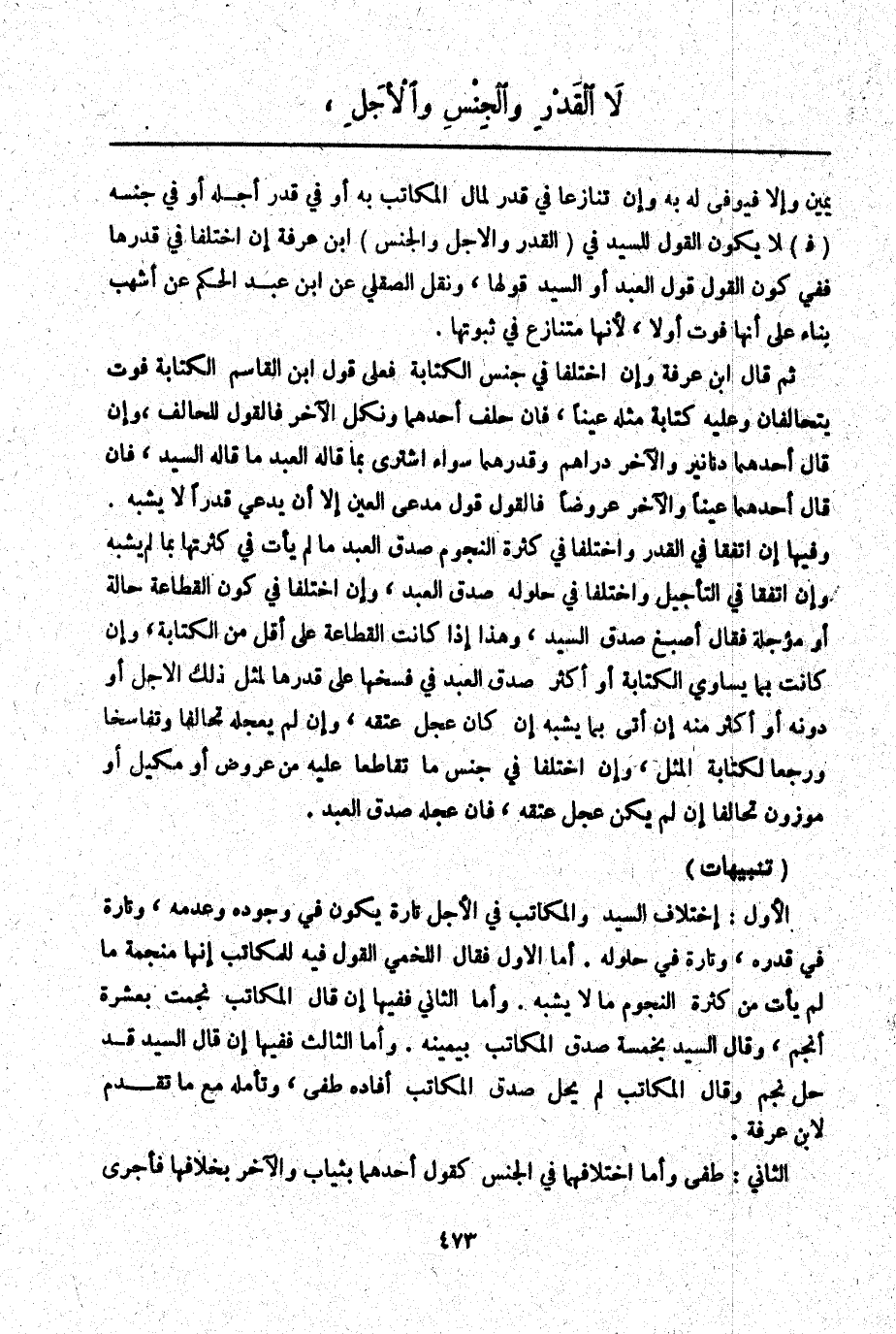 الْأَوَّلُ: اخْتِلَافُ السَّيِّدِ وَالْمُكَاتَبِ فِي الْأَجَلِ تَارَةً يَكُونُ فِي وُجُودِهِ وَعَدَمِهِ، وَتَارَةً فِي قَدْرِهِ، وَتَارَةً فِي حُلُولِهِ. أَمَّا الْأَوَّلُ فَقَالَ اللَّخْمِيُّ الْقَوْلُ فِيهِ لِلْمُكَاتَبِ إنَّهَا مُنَجَّمَةٌ مَا لَمْ يَأْتِ مِنْ كَثْرَةِ النُّجُومِ مَا لَا يُشْبِهُ. وَأَمَّا الثَّانِي فَفِيهَا إنْ قَالَ الْمُكَاتَبُ نَجَّمْت بِعَشَرَةِ أَنْجُمٍ، وَقَالَ السَّيِّدُ: بِخَمْسَةٍ صُدِّقَ الْمُكَاتَبُ بِيَمِينِهِ. وَأَمَّا الثَّالِثُ فَفِيهَا إنْ قَالَ السَّيِّدُ: قَدْ حَلَّ نَجْمٌ، وَقَالَ الْمُكَاتَبُ: لَمْ يَحِلَّ صُدِّقَ الْمُكَاتَبُ أَفَادَهُ طفي، وَتَأَمَّلْهُ مَعَ مَا تَقَدَّمَ لِابْنِ عَرَفَةَ.