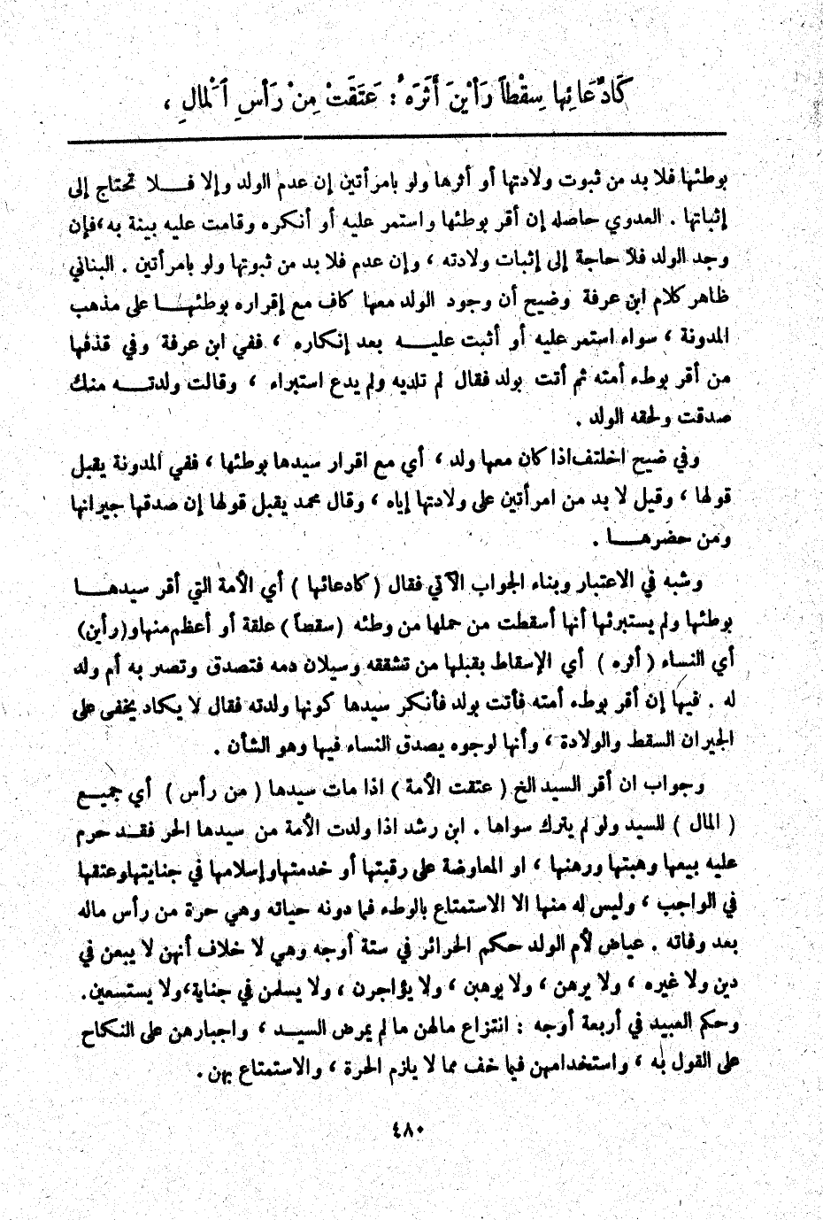 وَشَبَّهَ فِي الِاعْتِبَارِ وَبِنَاءِ الْجَوَابِ الْآتِي فَقَالَ (كَادِّعَائِهَا) أَيْ الْأَمَةِ الَّتِي أَقَرَّ سَيِّدُهَا بِوَطْئِهَا وَلَمْ يَسْتَبْرِئْهَا أَنَّهَا أَسْقَطَتْ مِنْ حَمْلِهَا مِنْ وَطْئِهِ (سِقْطًا) عَلَقَةً أَوْ أَعْظَمَ مِنْهَا وَ (رَأَيْنَ) أَيْ النِّسَاءُ (أَثَرَهُ) أَيْ الْإِسْقَاطِ بِقُبُلِهَا مِنْ تَشَقُّقِهِ وَسَيَلَانِ دَمِهِ فَتُصَدَّقُ وَتَصِيرُ بِهِ أُمَّ وَلَدٍ لَهُ. فِيهَا إنْ أَقَرَّ بِوَطْءِ أَمَتِهِ فَأَتَتْ بِوَلَدٍ فَأَنْكَرَ سَيِّدُهَا كَوْنَهَا وَلَدَتْهُ فَقَالَ: لَا يَكَادُ يَخْفَى عَلَى الْجِيرَانِ السِّقْطُ وَالْوِلَادَةُ، وَأَنَّهَا لِوُجُوهٍ يُصَدَّقُ النِّسَاءُ فِيهَا، وَهُوَ الشَّأْنُ، وَجَوَابُ إنْ أَقَرَّ السَّيِّدُ إلَخْ (عَتَقَتْ الْأَمَةُ) إذَا مَاتَ سَيِّدُهَا (مِنْ رَأْسِ) أَيْ جَمِيعِ (الْمَالِ) لِلسَّيِّدِ، وَلَوْ لَمْ يَتْرُكْ سِوَاهَا. ابْنُ رُشْدٍ إذَا وَلَدَتْ الْأَمَةُ مِنْ سَيِّدِهَا الْحُرِّ فَقَدْ حَرُمَ عَلَيْهِ بَيْعُهَا وَهِبَتُهَا وَرَهْنُهَا، أَوْ الْمُعَاوَضَةُ عَلَى رَقَبَتِهَا أَوْ خِدْمَتِهَا وَإِسْلَامِهَا فِي جِنَايَتِهَا وَعِتْقِهَا فِي الْوَاجِبِ، وَلَيْسَ لَهُ مِنْهَا إلَّا الِاسْتِمْتَاعُ بِالْوَطْءِ فَمَا دُونَهُ حَيَاتَهُ، وَهِيَ حُرَّةٌ مِنْ رَأْسِ مَالِهِ بَعْدَ وَفَاتِهِ. عِيَاضٌ لِأُمِّ الْوَلَدِ حُكْمُ الْحَرَائِرِ فِي سِتَّةِ أَوْجُهٍ وَهِيَ لَا خِلَافَ أَنَّهُنَّ لَا يُبَعْنَ فِي دَيْنٍ وَلَا غَيْرِهِ، وَلَا يُرْهَنَّ، وَلَا يُوهَبْنَ، وَلَا يُؤَاجَرْنَ، وَلَا يُسْلَمْنَ فِي جِنَايَةٍ، وَلَا يُسْتَسْعَيْنَ.