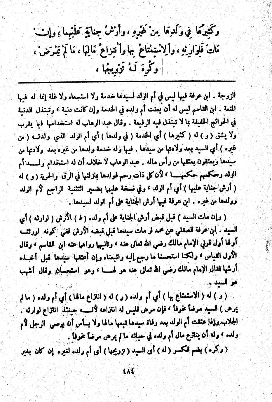 ـــــــــــــــــــــــــــــQالزَّوْجَةِ. ابْنُ عَرَفَةَ فِيهَا لَيْسَ فِي أُمِّ الْوَلَدِ لِسَيِّدِهَا خِدْمَةٌ وَلَا اسْتِسْعَاءٌ وَلَا غَلَّةٌ إنَّمَا لَهُ فِيهَا الْمُتْعَةُ. ابْنُ الْقَاسِمِ: لَيْسَ لَهُ أَنْ يُعْنِتَ أُمَّ وَلَدِهِ فِي الْخِدْمَةِ، وَإِنْ كَانَتْ دَنِيَّةً، وَتُبْتَذَلُ الدَّنِيَّةُ فِي الْحَوَائِجِ الْخَفِيفَةِ بِمَا لَا تُبْتَذَلُ فِيهِ الرَّفِيعَةُ. وَقَالَ عَبْدُ الْوَهَّابِ: لَهُ اسْتِخْدَامُهَا فِيمَا يَقْرُبُ، وَلَا يَشُقُّ (وَ) لَهُ (كَثِيرُهَا) أَيْ الْخِدْمَةِ (فِي وَلَدِهَا) أَيْ أُمِّ الْوَلَدِ الَّذِي وَلَدَتْهُ (مِنْ غَيْرِهِ) أَيْ السَّيِّدِ بَعْدَ وِلَادَتِهَا مِنْ سَيِّدِهَا. فِيهَا، وَلَهُ خِدْمَةُ وَلَدِهَا مِنْ غَيْرِهِ بَعْدَ وِلَادَتِهَا مِنْ سَيِّدِهَا وَيُعْتَقُونَ بِعِتْقِهَا مِنْ رَأْسِ مَالِهِ. عَبْدُ الْوَهَّابِ لَا خِلَافَ أَنَّ لَهُ اسْتِخْدَامَ وَلَدِ أُمِّ الْوَلَدِ وَحُكْمُهُمْ حُكْمُهَا؛ لِأَنَّ كُلَّ ذَاتِ رَحِمٍ فَوَلَدُهَا بِمَنْزِلَتِهَا فِي الرِّقِّ وَالْحُرِّيَّةِ