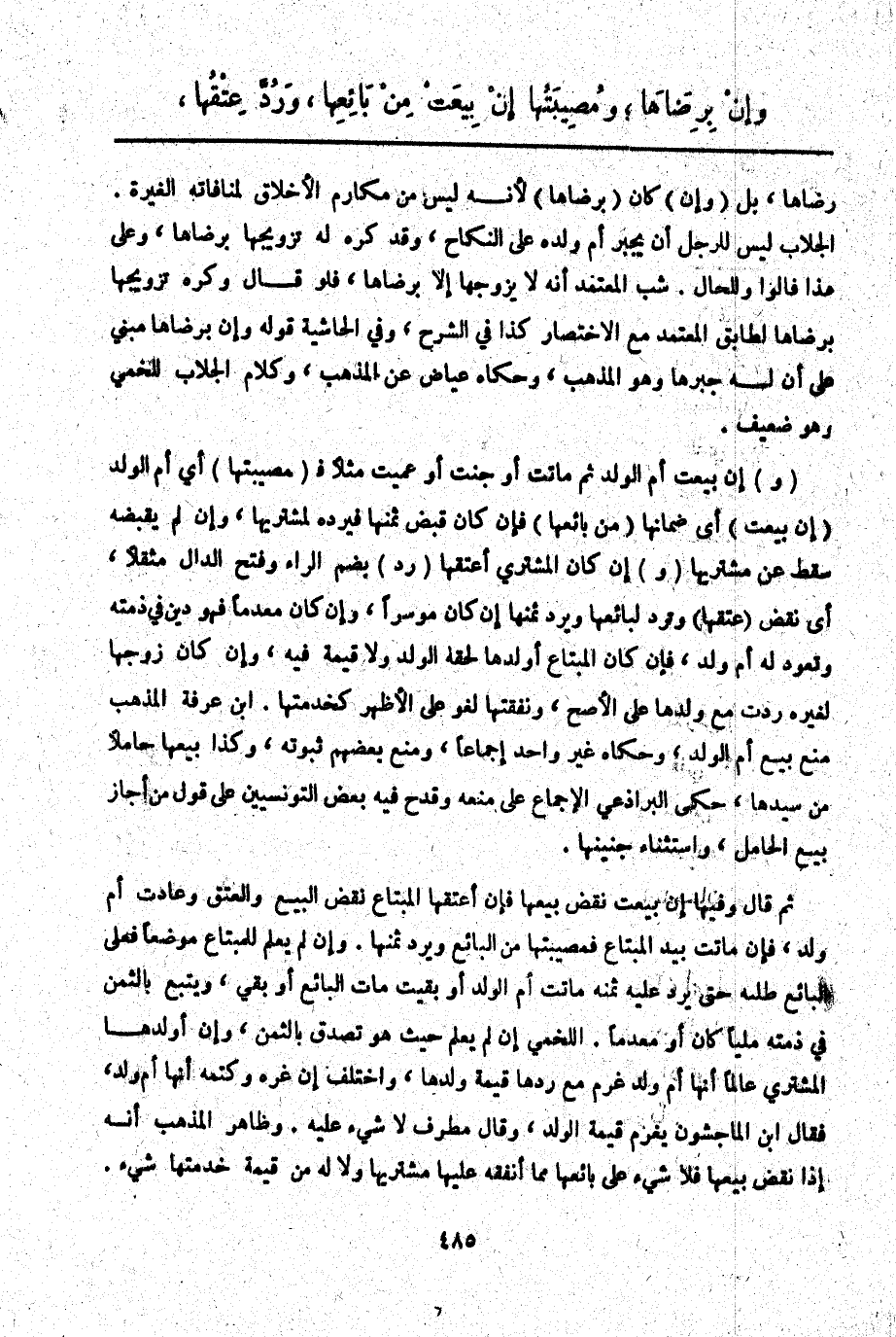 الْجَلَّابُ لَيْسَ لِلرَّجُلِ أَنْ يُجْبِرَ أُمَّ وَلَدِهِ عَلَى النِّكَاحِ، وَقَدْ كُرِهَ لَهُ تَزْوِيجُهَا بِرِضَاهَا، وَعَلَى هَذَا فَالْوَاوُ لِلْحَالِ. شب الْمُعْتَمَدُ أَنَّهُ لَا يُزَوِّجُهَا إلَّا بِرِضَاهَا، فَلَوْ قَالَ: وَكُرِهَ تَزْوِيجُهَا بِرِضَاهَا لَطَابَقَ الْمُعْتَمَدَ مَعَ الِاخْتِصَارِ كَذَا فِي الشَّرْحِ، وَفِي الْحَاشِيَةِ قَوْلُهُ: وَإِنْ بِرِضَاهَا مَبْنِيٌّ عَلَى أَنَّ لَهُ جَبْرَهَا، وَهُوَ الْمَذْهَبُ، وَحَكَاهُ عِيَاضٌ عَنْ الْمَذْهَبِ، وَكَلَامِ الْجَلَّابِ لِلَّخْمِيِّ وَهُوَ ضَعِيفٌ.