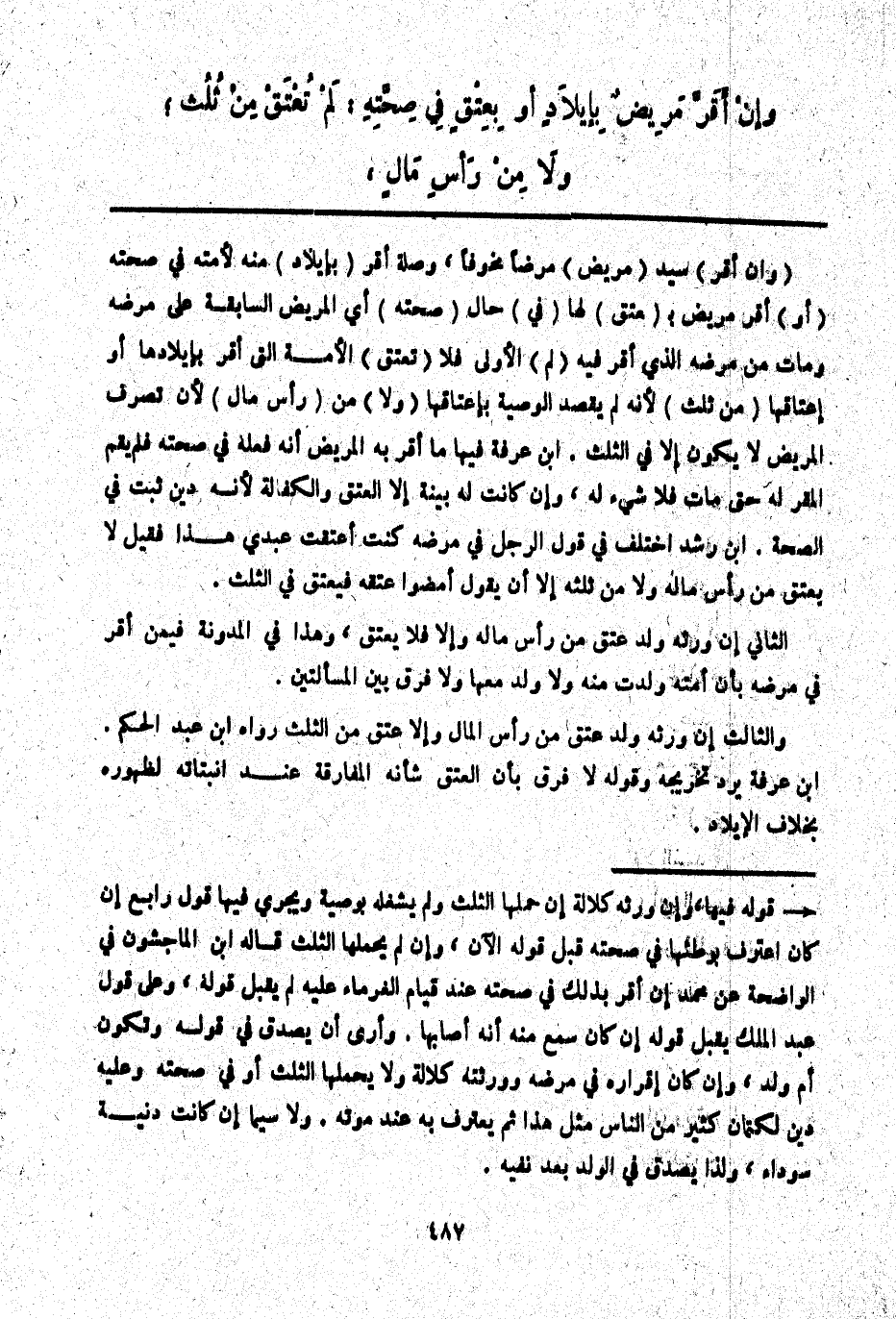 ـــــــــــــــــــــــــــــQوَإِنْ أَقَرَّ) سَيِّدٌ (مَرِيضٌ) مَرَضًا مَخُوفًا، وَصِلَةُ أَقَرَّ (بِإِيلَادٍ) مِنْهُ لِأَمَتِهِ فِي صِحَّتِهِ (أَوْ) أَقَرَّ مَرِيضٌ بِ (عِتْقٍ) لَهَا (فِي) حَالِ (صِحَّتِهِ) أَيْ الْمَرِيضِ السَّابِقَةِ عَلَى مَرَضِهِ، وَمَاتَ مِنْ مَرَضِهِ الَّذِي أَقَرَّ فِيهِ (لَمْ) الْأَوْلَى فَلَا (تُعْتَقْ) الْأَمَةُ الَّتِي أَقَرَّ بِإِيلَادِهَا أَوْ إعْتَاقِهَا (مِنْ ثُلُثٍ) ؛ لِأَنَّهُ لَمْ يَقْصِدْ الْوَصِيَّةَ بِإِعْتَاقِهَا (وَلَا) مِنْ (رَأْسِ مَالٍ) لِأَنَّ تَصَرُّفَ الْمَرِيضِ لَا يَكُونُ إلَّا فِي الثُّلُثِ. ابْنُ عَرَفَةَ فِيهَا مَا أَقَرَّ بِهِ الْمَرِيضُ أَنَّهُ فَعَلَهُ فِي صِحَّتِهِ فَلَمْ يَقُمْ الْمُقِرُّ لَهُ حَتَّى مَاتَ فَلَا شَيْءَ لَهُ، وَإِنْ كَانَتْ لَهُ بَيِّنَةٌ إلَّا الْعِتْقَ وَالْكَفَالَةَ؛ لِأَنَّهُ دَيْنٌ ثَبَتَ فِي الصِّحَّةِ. ابْنُ رُشْدٍ اُخْتُلِفَ فِي قَوْلِ الرَّجُلِ فِي مَرَضِهِ: كُنْت أَعْتَقْتُ عَبْدِي هَذَا فَقِيلَ: لَا يُعْتَقُ مِنْ رَأْسِ مَالِهِ، وَلَا مِنْ ثُلُثِهِ إلَّا أَنْ يَقُولَ: أَمْضُوا عِتْقَهُ فَيُعْتَقُ فِي الثُّلُثِ.
