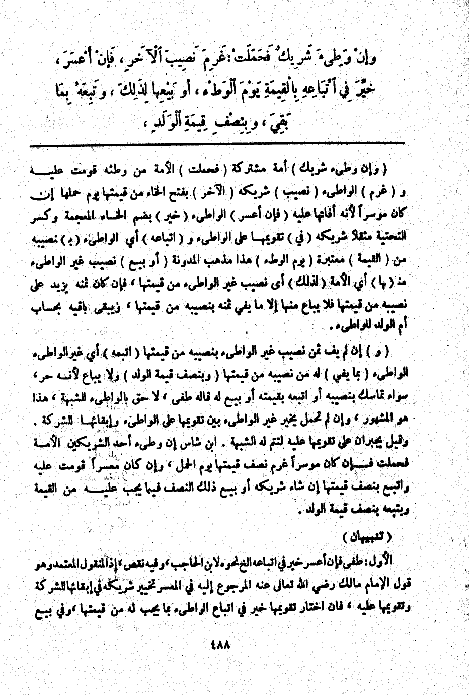 (تَنْبِيهَانِ) الْأَوَّلُ: طفي فَإِنْ أَعْسَرَ خُيِّرَ فِي اتِّبَاعِهِ إلَخْ نَحْوُهُ لِابْنِ الْحَاجِبِ، وَفِيهِ نَقْصٌ؛ إذْ الْمَنْقُولُ الْمُعْتَمَدُ، وَهُوَ قَوْلُ الْإِمَامِ مَالِكٍ - رَضِيَ اللَّهُ تَعَالَى عَنْهُ - الْمَرْجُوعُ إلَيْهِ فِي الْمُعْسِرِ تَخْيِيرُ شَرِيكِهِ فِي إبْقَائِهَا لِلشَّرِكَةِ وَتَقْوِيمِهَا عَلَيْهِ، فَإِنْ اخْتَارَ تَقْوِيمَهَا خُيِّرَ فِي اتِّبَاعِ الْوَاطِئِ بِمَا يَجِبُ لَهُ مِنْ قِيمَتِهَا، وَفِي بَيْعِ