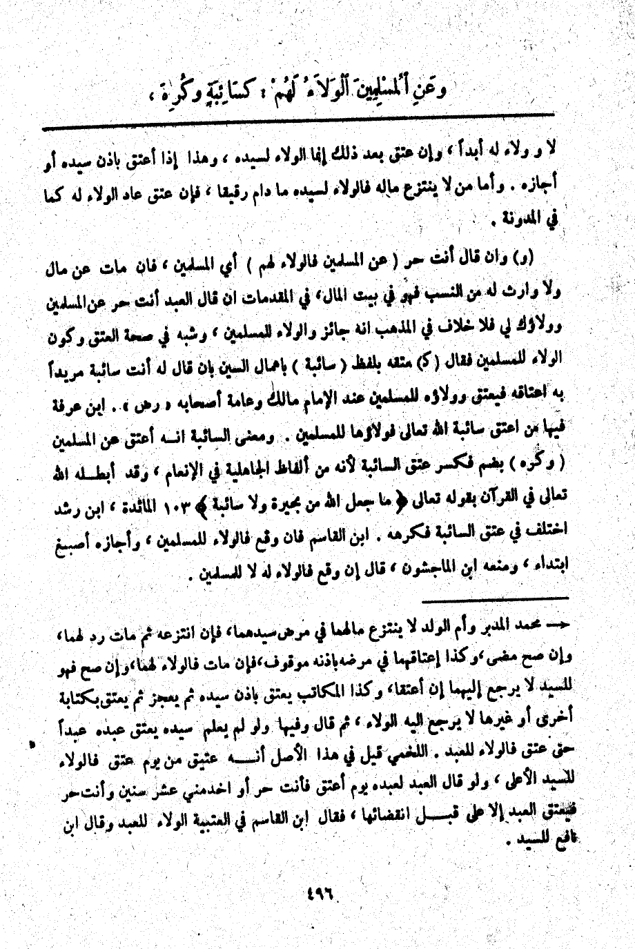 وَعَنْ الْمُسْلِمِينَ الْوَلَاءُ لَهُمْ: كَسَائِبَةٍ وَكُرِهَ