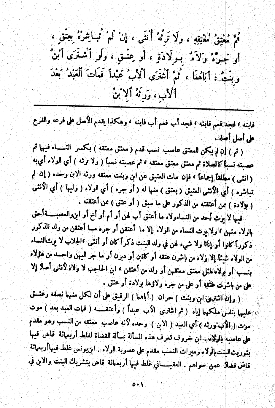 (وَإِنْ اشْتَرَى ابْنٌ وَبِنْتٌ) حُرَّانِ (أَبَاهُمَا) الرَّقِيقَ عَلَى أَنَّ لِكُلٍّ مِنْهُمَا نِصْفَهُ وَعَتَقَ عَلَيْهِمَا بِنَفْسِ مِلْكِهِمَا إيَّاهُ (ثُمَّ اشْتَرَى الْأَبُ عَبْدًا) وَأَعْتَقَهُ (فَمَاتَ الْعَبْدُ بَعْدَ) مَوْتِ (الْأَبِ وَرِثَهُ) أَيْ الْعَبْدَ (الِابْنُ) وَحْدَهُ لِأَنَّهُ عَاصِبُ مُعْتِقِهِ مِنْ النَّسَبِ وَهُوَ مُقَدَّمٌ عَلَى عَاصِبِهِ بِالْوَلَاءِ. ابْنُ خَرُوفٍ تُعْرَفُ هَذِهِ الْمَسْأَلَةُ بِمَسْأَلَةِ الْقُضَاةِ لِغَلَطِ أَرْبَعِمِائَةِ قَاضٍ فِيهَا بِتَوْرِيثِ الْبِنْتِ بِالْوَلَاءِ وَمِيرَاثُ النَّسَبِ مُقَدَّمٌ عَلَى عُصُوبَةِ الْوَلَاءِ. ابْنُ يُونُسَ غَلِطَ فِيهَا أَرْبَعُمِائَةِ قَاضٍ فَضْلًا عَمَّنْ سِوَاهُمْ. الْعُقْبَانِيُّ غَلِطَ فِيهَا أَرْبَعُمِائَةِ قَاضٍ بِتَشْرِيكِ الْبِنْتِ وَالِابْنِ فِي