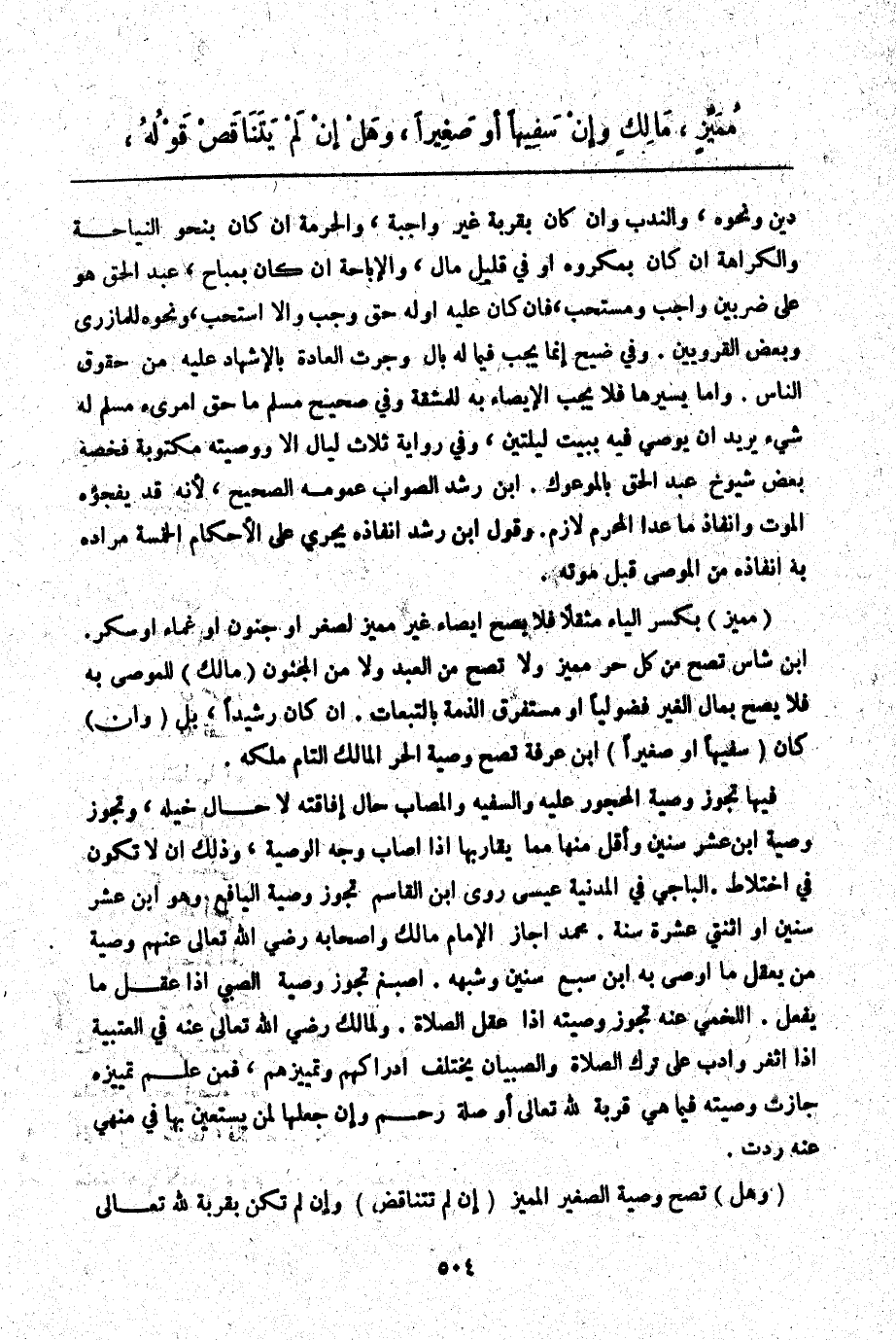 ابْنُ شَاسٍ تَصِحُّ مِنْ كُلِّ حُرٍّ مُمَيِّزٍ، وَلَا تَصِحُّ مِنْ الْعَبْدِ وَلَا مِنْ الْمَجْنُونِ (مَالِكٍ) لِلْمُوصَى بِهِ فَلَا يَصِحُّ بِمَالِ الْغَيْرِ فُضُولِيًّا أَوْ مُسْتَفْرِقَ الذِّمَّةِ بِالتَّبَعَاتِ. إنْ كَانَ رَشِيدًا، بَلْ (وَإِنْ) كَانَ (سَفِيهًا أَوْ صَغِيرًا) ابْنُ عَرَفَةَ تَصِحُّ وَصِيَّةُ الْحُرِّ الْمَالِكِ التَّامِّ مِلْكُهُ.