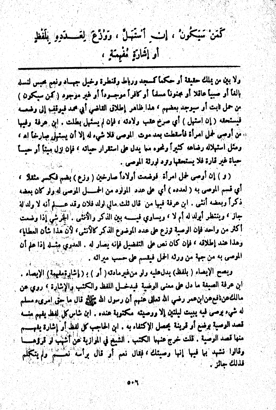 ـــــــــــــــــــــــــــــQوَلَا بَيْنَ مَنْ يَمْلِكُ حَقِيقَةً أَوْ حُكْمًا كَمَسْجِدٍ وَرِبَاطٍ وَقَنْطَرَةٍ وَخَيْلِ جِهَادٍ وَنَعَمٍ مُحْبَسٍ لِنَسْلِهِ بَالِغًا أَوْ صَبِيًّا عَاقِلًا أَوْ مَجْنُونًا مُسْلِمًا أَوْ كَافِرًا مَوْجُودًا أَوْ غَيْرَ مَوْجُودٍ (كَمَنْ سَيَكُونُ) مِنْ حَمْلٍ ثَابِتٍ أَوْ سَيُوجَدُ بَعْضُهُمْ، هَذَا ظَاهِرُ إطْلَاقِ الْقَاضِي أَبِي مُحَمَّدٍ فَيُوقَفُ إلَى وَضْعِهِ فَيَسْتَحِقُّهُ (إنْ اسْتَهَلَّ) أَيْ صَرَخَ عَقِبَ وِلَادَتِهِ، فَإِنْ لَمْ يَسْتَهِلَّ بَطَلَتْ. ابْنُ عَرَفَةَ وَفِيهَا مَنْ أَوْصَى لِحَمْلِ امْرَأَةٍ فَأَسْقَطَتْ بَعْدَ مَوْتِ الْمُوصِي فَلَا شَيْءَ لَهُ إلَّا أَنْ يَسْتَهِلَّ صَارِخًا. اهـ. وَمِثْلُ اسْتِهْلَالِهِ رَضَاعُهُ كَثِيرًا وَنَحْوُهُ مِمَّا يَدُلُّ عَلَى اسْتِقْرَارِ حَيَاتِهِ، فَإِنْ نَزَلَ مَيِّتًا أَوْ حَيًّا حَيَاةً غَيْرَ قَارَّةٍ فَلَا يَسْتَحِقُّهَا وَتُرَدُّ لِوَرَثَةِ الْمُوصِي.