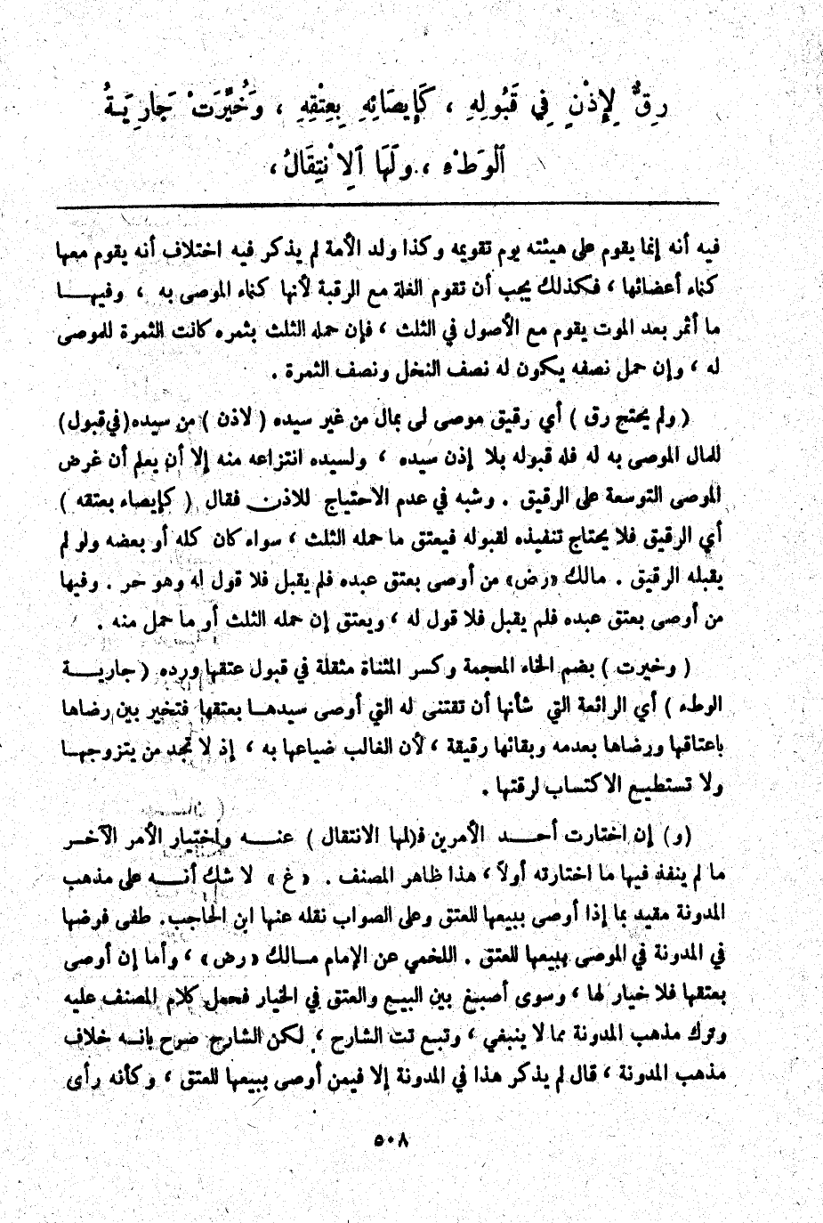 (وَلَمْ يَحْتَجْ رِقٌّ) أَيْ رَقِيقٌ مُوصًى لِي بِمَالٍ مِنْ غَيْرِ سَيِّدِهِ (لِإِذْنٍ) مِنْ سَيِّدِهِ (فِي قَبُولِهِ) لِلْمَالِ الْمُوصَى بِهِ لَهُ فَلَهُ قَبُولُهُ بِلَا إذْنِ سَيِّدِهِ، وَلِسَيِّدِهِ انْتِزَاعُهُ مِنْهُ إلَّا أَنْ يَعْلَمَ أَنَّ غَرَضَ الْمُوصِي التَّوْسِعَةُ عَلَى الرَّقِيقِ. وَشَبَّهَ فِي عَدَمِ الِاحْتِيَاجِ لِلْإِذْنِ فَقَالَ (كَإِيصَاءٍ بِعِتْقِهِ) أَيْ الرَّقِيقِ فَلَا يَحْتَاجُ تَنْفِيذُهُ لِقَبُولِهِ فَيُعْتَقُ مَا حَمَلَهُ الثُّلُثُ، سَوَاءٌ كَانَ كُلَّهُ أَوْ بَعْضَهُ، وَلَوْ لَمْ يَقْبَلْهُ الرَّقِيقُ. مَالِكٌ " - رَضِيَ اللَّهُ عَنْهُ - " مَنْ أَوْصَى بِعِتْقِ عَبْدِهِ فَلَمْ يَقْبَلْ فَلَا قَوْلَ لَهُ، وَهُوَ حُرٌّ. وَفِيهَا مَنْ أَوْصَى بِعِتْقِ عَبْدِهِ فَلَمْ يَقْبَلْ فَلَا قَوْلَ لَهُ، وَيَعْتِقُ إنْ حَمَلَهُ الثُّلُثُ أَوْ مَا حَمَلَ مِنْهُ.