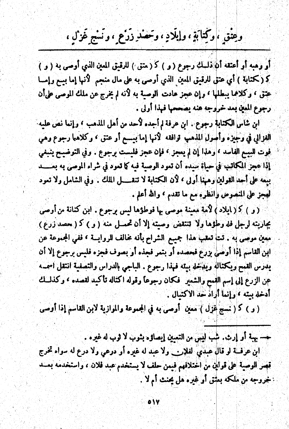 (وَ) كَ (إيلَادٍ) لِأَمَةٍ مُعَيَّنَةٍ مُوصًى بِهَا فَوَطْؤُهَا لَيْسَ بِرُجُوعٍ. ابْنُ كِنَانَةَ مَنْ أَوْصَى بِجَارِيَتِهِ لِرَجُلٍ فَلَهُ وَطْؤُهَا وَلَا تُنْتَقَضُ وَصِيَّتُهُ إلَّا أَنْ تَحْمِلَ مِنْهُ (وَ) كَ (حَصْدِ زَرْعٍ) مُعَيَّنٍ مُوصًى بِهِ. تت تَعَقَّبَ هَذَا جَمِيعُ الشُّرَّاحِ بِأَنَّهُ مُخَالِفٌ لِلرِّوَايَةِ، فَفِي الْمَجْمُوعَةِ عَنْ ابْنِ الْقَاسِمِ إذَا أَوْصَى بِزَرْعٍ فَحَصَدَهُ أَوْ بِتَمْرٍ فَجَذَّهُ أَوْ بِصُوفٍ فَجَزَّهُ فَلَيْسَ بِرُجُوعٍ إلَّا أَنْ يَدْرُسَ الْقَمْحَ وَيَكْتَالَهُ وَيُدْخِلَهُ بَيْتَهُ فَهَذَا رُجُوعٌ. الْبَاجِيَّ بِالدِّرَاسِ وَالتَّصْفِيَةِ انْتَقَلَ اسْمُهُ عَنْ الزَّرْعِ إلَى اسْمِ الْقَمْحِ وَالشَّعِيرِ فَكَانَ رُجُوعًا، وَقَوْلُهُ: اكْتَالَهُ تَأْكِيدٌ لِقَصْدِهِ، وَكَذَلِكَ أَدْخَلَهُ بَيْتَهُ، وَإِنَّمَا أَرَادَ حَدَّ الِاكْتِيَالِ.