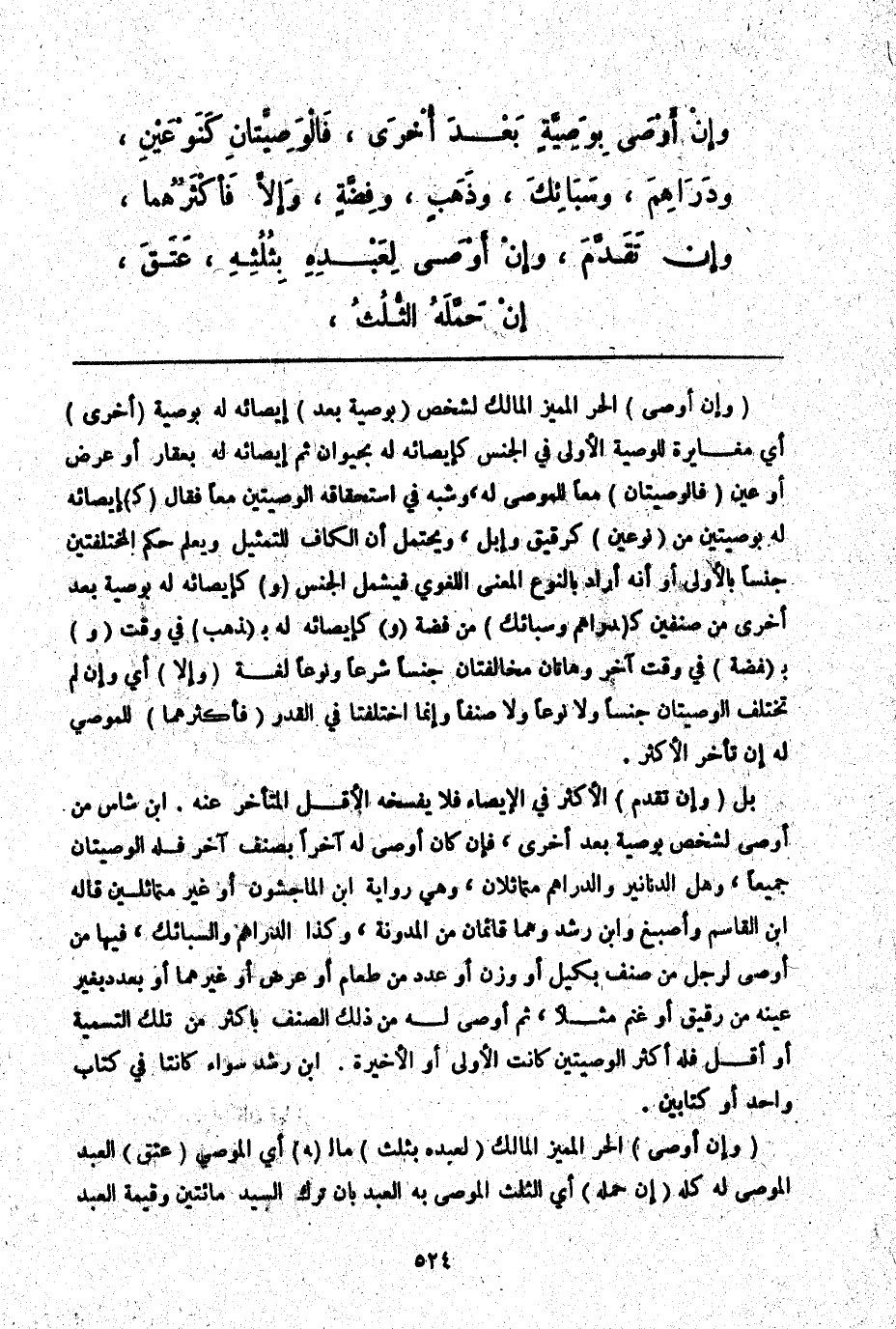 بَلْ (وَإِنْ تَقَدَّمَ) الْأَكْثَرُ فِي الْإِيصَاءِ فَلَا يَفْسَخُهُ الْأَقَلُّ الْمُتَأَخِّرُ عَنْهُ. ابْنُ شَاسٍ مَنْ أَوْصَى لِشَخْصٍ بِوَصِيَّةٍ بَعْدَ أُخْرَى، فَإِنْ كَانَ أَوْصَى لَهُ آخِرًا بِصِنْفٍ آخَرَ فَلَهُ الْوَصِيَّتَانِ جَمِيعًا، وَهَلْ الدَّنَانِيرُ وَالدَّرَاهِمُ مُتَمَاثِلَانِ، وَهِيَ رِوَايَةُ ابْنِ الْمَاجِشُونِ أَوْ غَيْرُ مُتَمَاثِلَيْنِ قَالَهُ ابْنُ الْقَاسِمِ وَأَصْبَغُ وَابْنُ رُشْدٍ وَهُمَا قَائِمَانِ مِنْ الْمُدَوَّنَةِ، وَكَذَا الدَّرَاهِمُ وَالسَّبَائِكُ، فِيهَا مَنْ أَوْصَى لِرَجُلٍ مِنْ صِنْفٍ بِكَيْلٍ أَوْ وَزْنٍ أَوْ عَدَدٍ مِنْ طَعَامٍ أَوْ عَرَضٍ أَوْ غَيْرِهِمَا أَوْ بِعَدَدٍ بِغَيْرِ عَيْنِهِ مِنْ رَقِيقٍ أَوْ غَنَمٍ مَثَلًا، ثُمَّ أَوْصَى لَهُ مِنْ ذَلِكَ الصِّنْفِ بِأَكْثَرَ مِنْ تِلْكَ التَّسْمِيَةِ أَوْ أَقَلَّ فَلَهُ أَكْثَرُ الْوَصِيَّتَيْنِ كَانَتْ الْأُولَى أَوْ الْأَخِيرَةَ. ابْنُ رُشْدٍ سَوَاءٌ كَانَتَا فِي كِتَابٍ وَاحِدٍ أَوْ كِتَابَيْنِ.