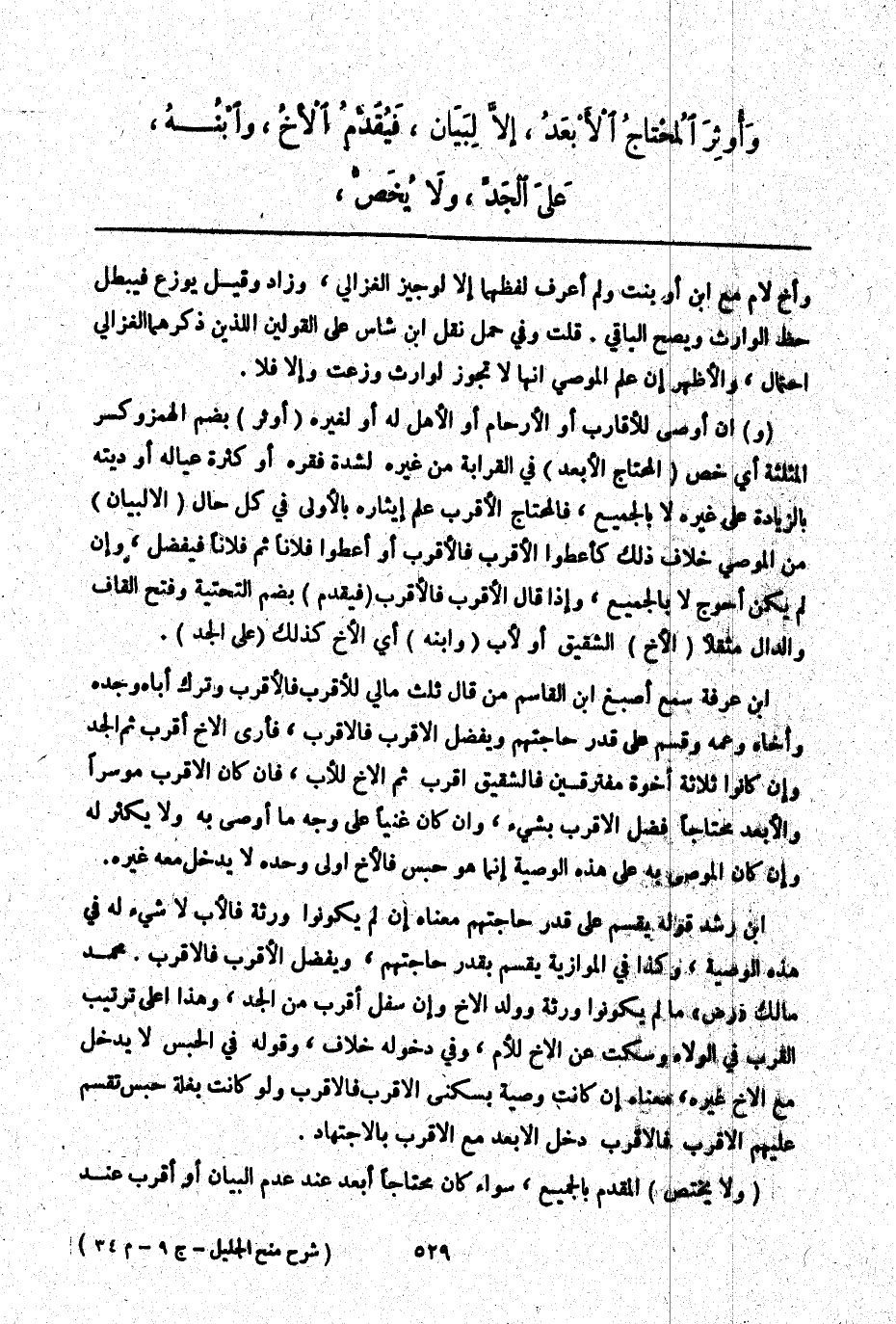 (وَ) إنْ أَوْصَى لِلْأَقَارِبِ أَوْ الْأَرْحَامِ أَوْ الْأَهْلِ لَهُ أَوْ لِغَيْرِهِ (أُوثِرَ) بِضَمِّ الْهَمْزِ وَكَسْرِ الْمُثَلَّثَةِ أَيْ خُصَّ (الْمُحْتَاجُ الْأَبْعَدُ) فِي الْقَرَابَةِ مِنْ غَيْرِهِ لِشِدَّةِ فَقْرِهِ أَوْ كَثْرَةِ عِيَالِهِ أَوْ دِيَتِهِ بِالزِّيَادَةِ عَلَى غَيْرِهِ لَا بِالْجَمِيعِ، فَالْمُحْتَاجُ الْأَقْرَبُ عَلَى إيثَارِهِ بِالْأَوْلَى فِي كُلِّ حَالٍ (إلَّا لِبَيَانٍ) مِنْ الْمُوصِي خِلَافِ ذَلِكَ كَأَعْطُوا الْأَقْرَبَ فَالْأَقْرَبَ أَوْ أَعْطُوا فُلَانًا ثُمَّ فُلَانًا فَيُفَضَّلُ، وَإِنْ لَمْ يَكُنْ أَحْوَجَ لَا بِالْجَمِيعِ، وَإِذَا قَالَ الْأَقْرَبَ فَالْأَقْرَبَ (فَيُقَدَّمُ) بِضَمِّ التَّحْتِيَّةِ وَفَتْحِ الْقَافِ وَالدَّالِ مُثَقَّلًا (الْأَخُ) الشَّقِيقُ أَوْ الْأَبُ (وَابْنُهُ) أَيْ الْأَخِ كَذَلِكَ (عَلَى الْجَدِّ) .