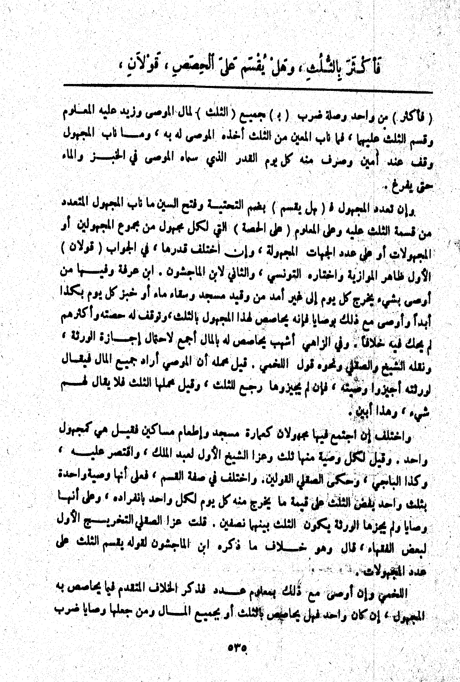وَإِنْ تَعَدَّدَ الْمَجْهُولُ فَ (هَلْ يُقْسَمُ) بِضَمِّ التَّحْتِيَّةِ وَفَتْحِ السِّينِ مَا نَابَ الْمَجْهُولَ الْمُتَعَدِّدَ مِنْ قِسْمَةِ الثُّلُثِ عَلَيْهِ، وَعَلَى الْمَعْلُومِ (عَلَى الْحِصَّةِ) الَّتِي لِكُلِّ مَجْهُولٍ مِنْ مَجْمُوعِ الْمَجْهُولِينَ أَوْ الْمَجْهُولَاتِ أَوْ عَلَى عَدَدِ الْجِهَاتِ الْمَجْهُولَةِ، وَإِنْ اخْتَلَفَ قَدْرُهَا، فِي الْجَوَابِ (قَوْلَانِ) الْأَوَّلُ ظَاهِرُ الْمَوَّازِيَّةِ وَاخْتَارَهُ التُّونُسِيُّ وَالثَّانِي لِابْنِ الْمَاجِشُونِ. ابْنُ عَرَفَةَ وَفِيهَا مَنْ أَوْصَى بِشَيْءٍ يُخْرَجُ كُلَّ يَوْمٍ إلَى غَيْرِ أَمَدٍ مِنْ وَقِيدِ مَسْجِدٍ وَسِقَاءِ مَاءٍ أَوْ خُبْزٍ كُلَّ يَوْمٍ بِكَذَا أَبَدًا وَأَوْصَى مَعَ ذَلِكَ بِوَصَايَا فَإِنَّهُ يُحَاصِصُ لِهَذَا الْمَجْهُولِ بِالثُّلُثِ، وَتُوقَفُ لَهُ حِصَّتُهُ وَأَكْثَرُهُمْ لَمْ يَحْكِ فِيهِ خِلَافًا. وَفِي الزَّاهِيِّ أَشْهَبُ يُحَاصِصُ لَهُ بِالْمَالِ أَجْمَعَ لِاحْتِمَالِ إجَازَةِ الْوَرَثَةِ، وَنَقَلَهُ الشَّيْخُ وَالصِّقِلِّيُّ وَنَحْوُهُ قَوْلُ اللَّخْمِيِّ. قِيلَ: مَحْمَلُهُ أَنَّ الْمُوصِيَ أَرَادَ جَمِيعَ الْمَالِ فَيُقَالُ لِوَرَثَتِهِ أُجِيزُوا وَصِيَّتَهُ، فَإِنْ لَمْ يُجِيزُوهَا رَجَعَ لِلثُّلُثِ، وَقِيلَ مَحْمَلُهَا الثُّلُثُ يُقَالُ لَهُمْ شَيْءٌ، وَهَذَا أَبْيَنُ.