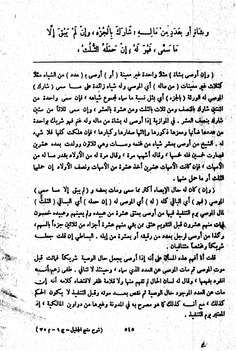 قُلْت: أَنَا أَفْهَمُ هَذِهِ الْمَسْأَلَةَ عَلَى أَنَّهُ إذَا أَوْصَى يُجْعَلُ حَالَ الْوَصِيَّةِ شَرِيكًا فَمَاتَتْ قَبْلَ مَوْتِ الْمُوصِي ثُمَّ مَاتَ الْمُوصِي عَنْ الْعَدَدِ الَّذِي سَمَّاهُ، وَحِينَئِذٍ لَا تَنَافِيَ. طفي زَعَمَ أَنَّهُ انْفَرَدَ بِفَهْمِهَا، وَقَالَ لَهُ لِسَانُ الْحَالِ: لَمْ تَفْهَمْ مِنْهَا، وَلَا قُلَامَةَ ظُفْرٍ لِاقْتِضَاءِ كَلَامِهِ أَنَّهُ إنْ مَاتَ عَنْ الْعَدَدِ الْمَوْجُودِ حَالَ الْوَصِيَّةِ ثُمَّ نَقَصَ بَعْدَ مَوْتِهِ وَقَبْلَ التَّنْفِيذِ لَا يَكُونُ الْحُكْمُ كَذَلِكَ، مَعَ أَنَّهُ كَذَلِكَ كَمَا هُوَ مُصَرَّحٌ بِهِ فِي الْمُدَوَّنَةِ وَغَيْرِهَا مِنْ دَوَاوِينِ الْمَالِكِيَّةِ؛ إذْ الْمُعْتَبَرُ يَوْمُ التَّنْفِيذِ.
