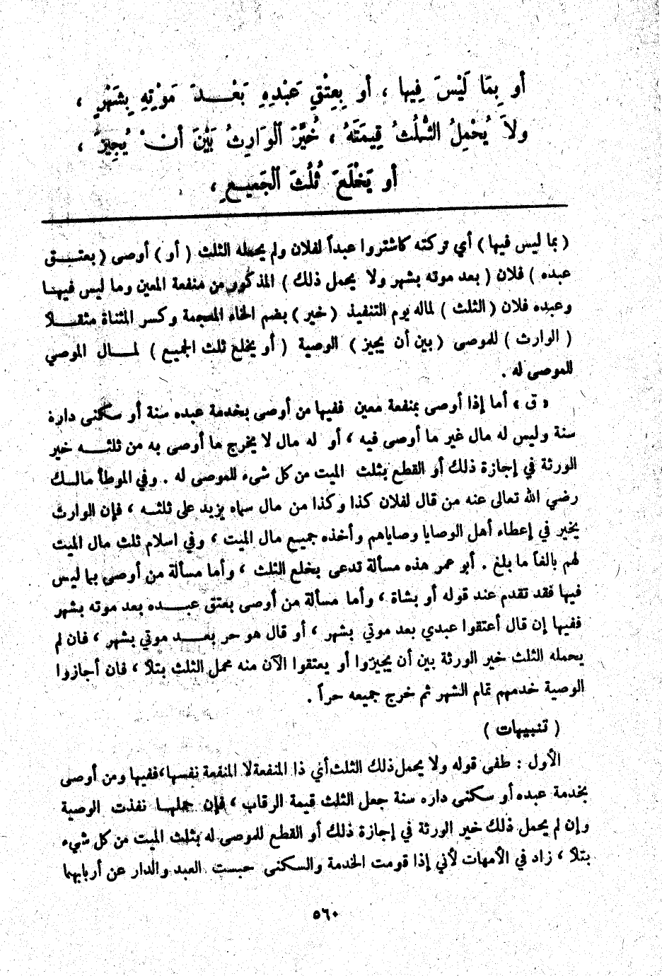 ـــــــــــــــــــــــــــــQبِمَا لَيْسَ فِيهَا) أَيْ تَرِكَتِهِ كَاشْتَرُوا عَبْدًا لِفُلَانٍ، وَلَمْ يَحْمِلْهُ الثُّلُثُ (أَوْ) أَوْصَى (بِعِتْقِ عَبْدِهِ) فُلَانٍ (بَعْدَ مَوْتِهِ بِشَهْرٍ وَلَا يَحْمِلُ ذَلِكَ) الْمَذْكُورَ مِنْ مَنْفَعَةِ الْمُعَيَّنِ وَمَا لَيْسَ فِيهَا، وَعَبْدِهِ فُلَانٍ (الثُّلُثُ) لِمَالِهِ يَوْمَ التَّنْفِيذِ (خُيِّرَ) بِضَمِّ الْخَاءِ الْمُعْجَمَةِ وَكَسْرِ الْمُثَنَّاةِ مُثَقَّلًا (الْوَارِثُ) لِلْمُوصِي (بَيْنَ أَنْ يُجِيزَ) الْوَصِيَّةَ (أَوْ يَخْلَعَ ثُلُثَ الْجَمِيعِ) لِمَالِ الْمُوصِي لِلْمُوصَى لَهُ.