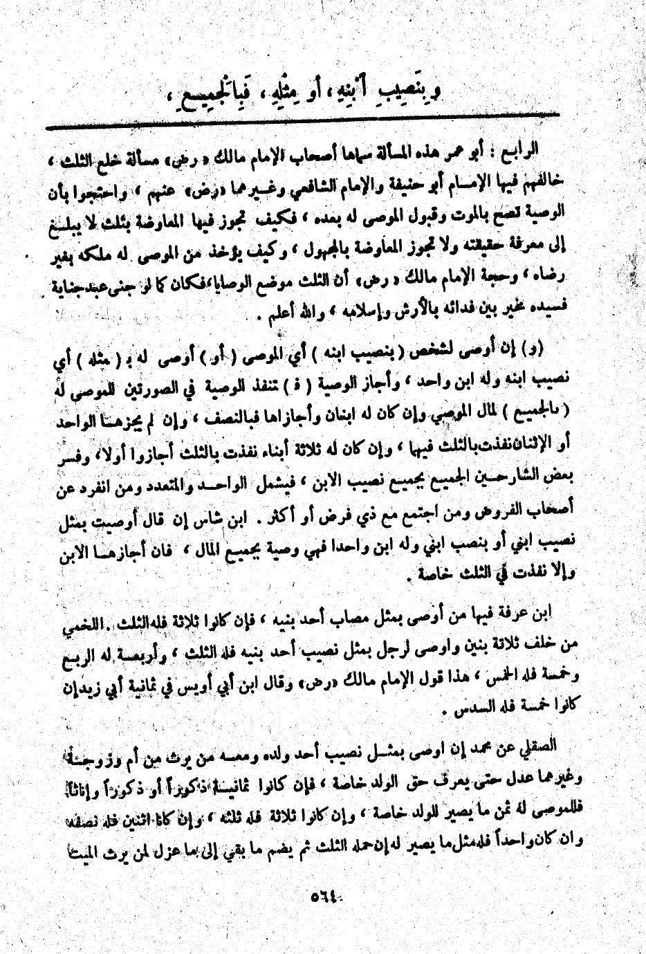 ابْنُ عَرَفَةَ فِيهَا مَنْ أَوْصَى بِمِثْلِ نِصَابِ أَحَدِ بَنِيهِ، فَإِنْ كَانُوا ثَلَاثَةً فَلَهُ الثُّلُثُ. اللَّخْمِيُّ مَنْ خَلَّفَ ثَلَاثَةَ بَنِينَ وَأَوْصَى لِرَجُلٍ بِمِثْلِ نَصِيبِ أَحَدِ بَنِيهِ فَلَهُ الثُّلُثُ، وَأَرْبَعَةً لَهُ الرُّبُعُ وَخَمْسَةً فَلَهُ الْخُمُسُ، هَذَا قَوْلُ الْإِمَامِ مَالِكٍ " - رَضِيَ اللَّهُ عَنْهُ - " وَقَالَ ابْنُ أَبِي أُوَيْسٍ فِي ثَمَانِيَةِ أَبِي زَيْدٍ إنْ كَانُوا خَمْسَةً فَلَهُ السُّدُسُ.