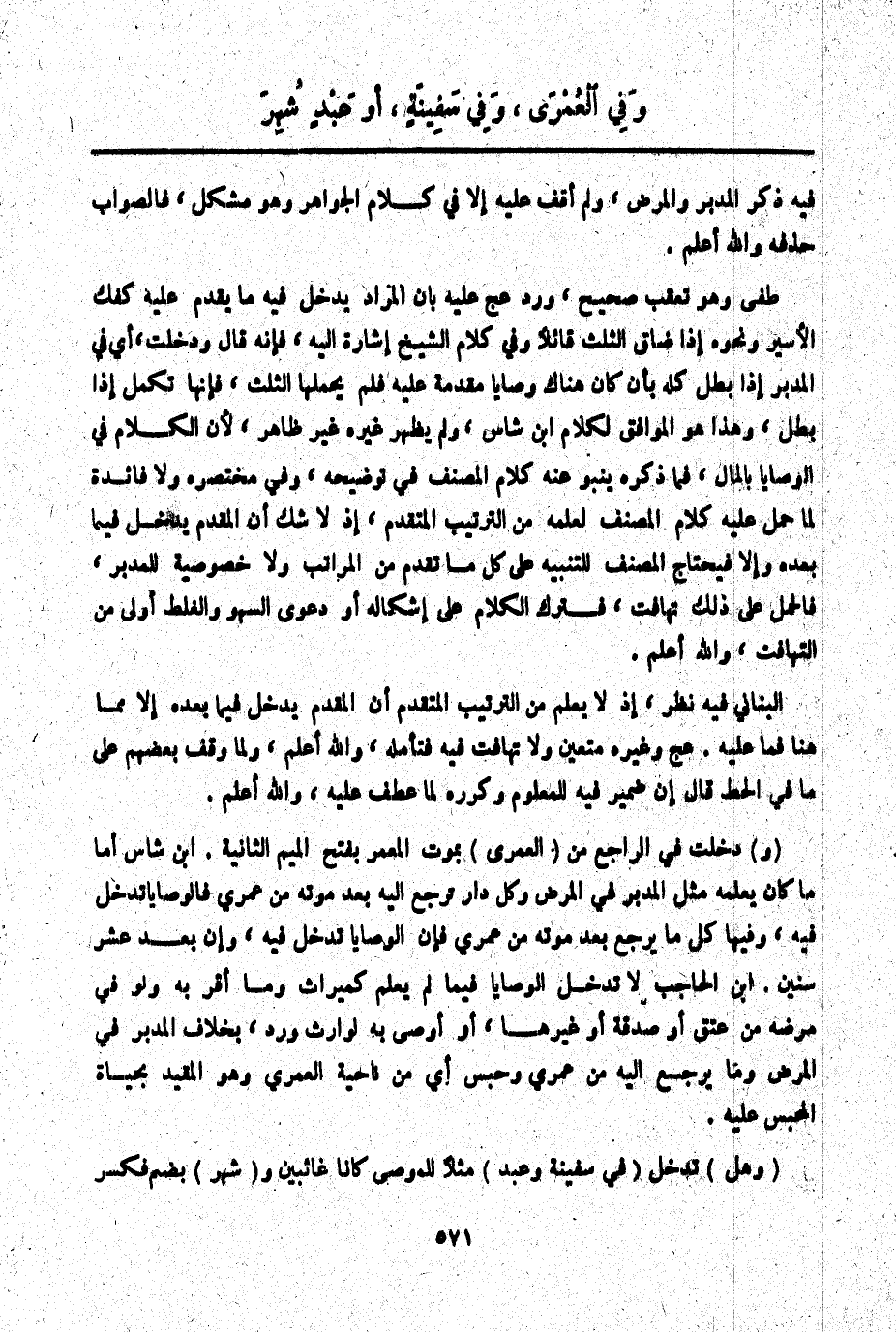 الْبُنَانِيُّ فِيهِ نَظَرٌ؛ إذْ لَا يُعْلَمُ مِنْ التَّرْتِيبِ الْمُتَقَدِّمِ أَنَّ الْمُقَدَّمَ يَدْخُلُ فِيمَا بَعْدَهُ إلَّا مِمَّا هُنَا فَمَا عَلَيْهِ. عج وَغَيْرُهُ مُتَعَيِّنٌ، وَلَا تَهَافُتَ فِيهِ فَتَأَمَّلْهُ، وَاَللَّهُ أَعْلَمُ، وَلَمَّا وَقَفَ بَعْضُهُمْ عَلَى مَا فِي الْحَطّ قَالَ: إنَّ ضَمِيرَ فِيهِ لِلْمَعْلُومِ، وَكَرَّرَهُ لَمَّا عَطَفَ عَلَيْهِ، وَاَللَّهُ أَعْلَمُ. (وَ) دَخَلَتْ فِي الرَّاجِعِ مِنْ (الْعُمْرَى) يَمُوتُ الْمُعْمَرُ بِفَتْحِ الْمِيمِ الثَّانِيَةِ. ابْنُ شَاسٍ أَمَّا مَا كَانَ يَعْلَمُهُ مِثْلَ الْمُدَبَّرِ فِي الْمَرَضِ وَكُلُّ دَارٍ تَرْجِعُ إلَيْهِ بَعْدَ مَوْتِهِ مِنْ عُمْرَى فَالْوَصَايَا تَدْخُلُ فِيهِ، وَفِيهَا كُلُّ مَا يَرْجِعُ بَعْدَ مَوْتِهِ مِنْ عُمْرَى فَإِنَّ الْوَصَايَا تَدْخُلُ فِيهِ، وَإِنْ بَعْدَ عَشْرِ سِنِينَ. ابْنُ الْحَاجِبِ لَا تَدْخُلُ الْوَصَايَا فِيمَا لَمْ يُعْلَمْ كَمِيرَاثٍ، وَمِمَّا أَقَرَّ بِهِ، وَلَوْ فِي مَرَضِهِ مِنْ عِتْقٍ أَوْ صَدَقَةٍ أَوْ غَيْرِهَا، أَوْ أَوْصَى بِهِ لِوَارِثٍ وَرُدَّ، بِخِلَافِ الْمُدَبَّرِ فِي الْمَرَضِ وَمَا يَرْجِعُ إلَيْهِ مِنْ عُمْرَى حَبْسٍ أَيْ مِنْ نَاحِيَةِ الْعُمْرَى، وَهُوَ الْمُقَيَّدُ بِحَيَاةِ الْمَحْبَسِ عَلَيْهِ.