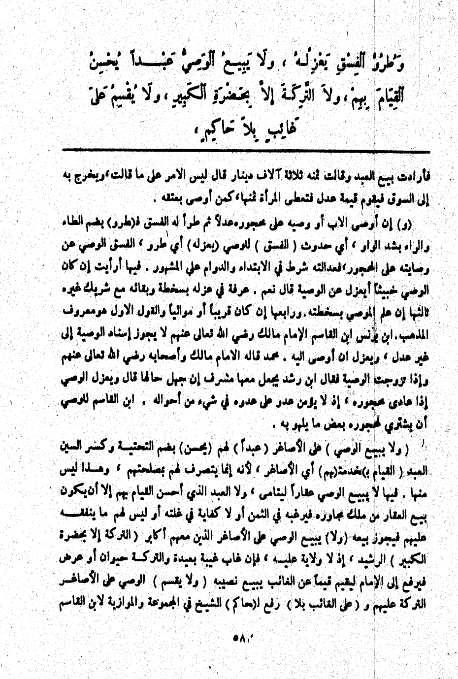 (وَلَا يَبِيعُ الْوَصِيُّ) عَلَى الْأَصَاغِرِ (عَبْدًا) لَهُمْ (يُحْسِنُ) بِضَمِّ التَّحْتِيَّةِ وَكَسْرِ السِّينِ الْعَبْدُ (الْقِيَامَ بِ) خَدَمْت (هِمْ) أَيْ الْأَصَاغِرِ لِأَنَّهُ إنَّمَا يَتَصَرَّفُ لَهُمْ بِمَصْلَحَتِهِمْ، وَهَذَا لَيْسَ مِنْهَا. فِيهَا لَا يَبِيعُ الْوَصِيُّ عَقَارًا لِيَتَامَى، وَلَا الْعَبْدَ الَّذِي أَحْسَنَ الْقِيَامَ بِهِمْ إلَّا أَنْ يَكُونَ بَيْعُ الْعَقَارِ مِنْ مِلْكِ مُجَاوِرِهِ فَيُرَغِّبَهُ فِي الثَّمَنِ أَوْ لَا كِفَايَةَ فِي غَلَّتِهِ أَوْ لَيْسَ لَهُمْ مَا يُنْفِقُهُ عَلَيْهِمْ فَيَجُوزُ بَيْعُهُ (وَلَا) يَبِيعُ الْوَصِيُّ عَلَى الْأَصَاغِرِ الَّذِينَ مَعَهُمْ أَكَابِرُ (التَّرِكَةَ إلَّا بِحَضْرَةِ الْكَبِيرِ) الرَّشِيدِ؛ إذْ لَا وِلَايَةَ عَلَيْهِ، فَإِنْ غَابَ غَيْبَةً بَعِيدَةً، وَالتَّرِكَةُ حَيَوَانٌ أَوْ عَرَضٌ فَيَرْفَعُ إلَى الْإِمَامِ لِيُقِيمَ قَيِّمًا عَنْ الْغَائِبِ يَبِيعُ نَصِيبَهُ (وَلَا يُقْسِمُ) الْوَصِيُّ عَلَى الْأَصَاغِرِ التَّرِكَةَ عَلَيْهِمْ وَ (عَلَى الْغَائِبِ بِلَا) رَفْعٍ لِ (حَاكِمٍ) الشَّيْخُ فِي الْمَجْمُوعَةِ وَالْمَوَّازِيَّةِ لِابْنِ الْقَاسِمِ