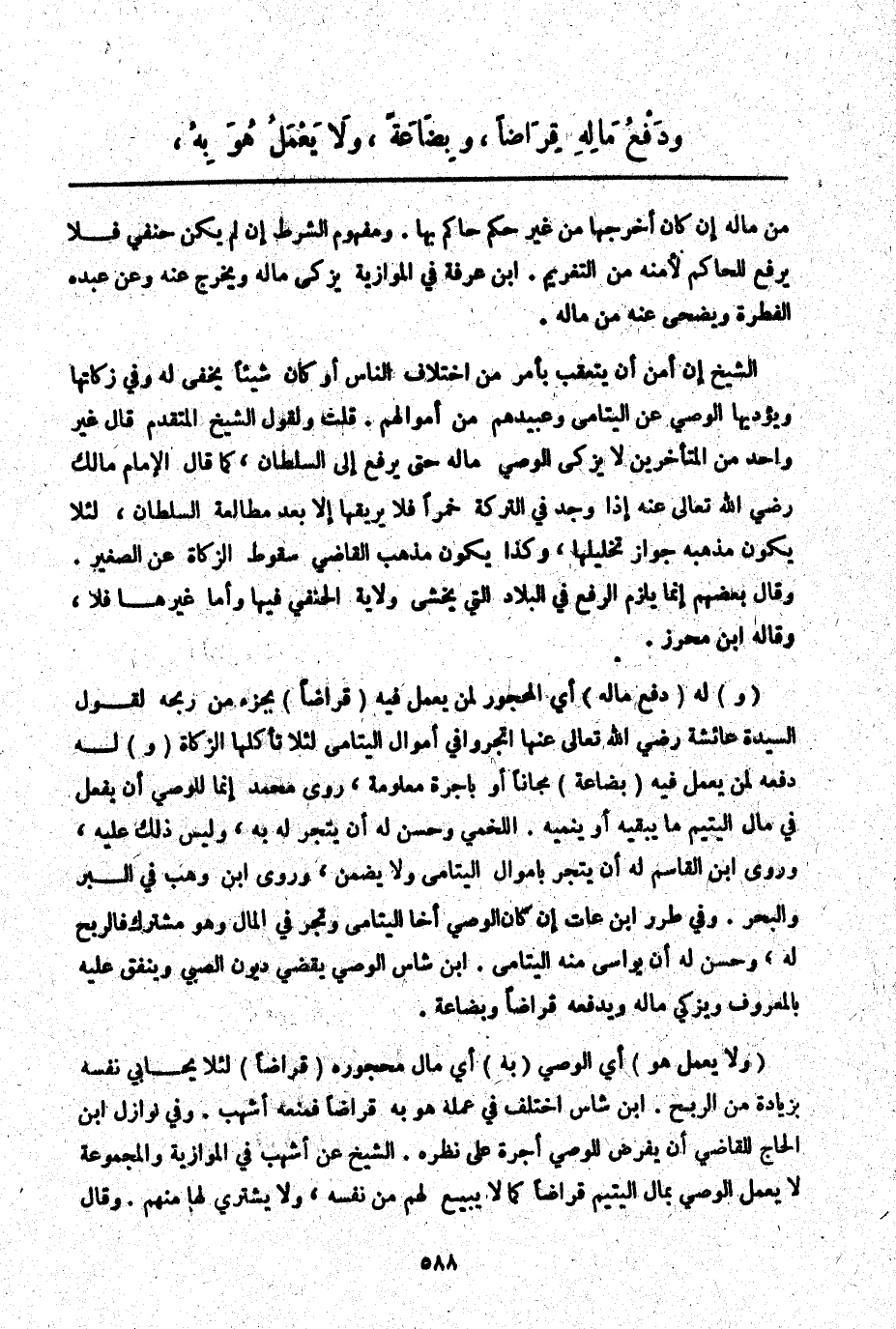 (وَ) لَهُ (دَفْعُ مَالِهِ) أَيْ الْمَحْجُورِ لِمَنْ يَعْمَلُ فِيهِ (قِرَاضًا) بِجُزْءٍ مِنْ رِبْحِهِ لِقَوْلِ السَّيِّدَةِ عَائِشَةَ - رَضِيَ اللَّهُ عَنْهَا - اتَّجِرُوا فِي أَمْوَالِ الْيَتَامَى لِئَلَّا تَأْكُلَهَا الزَّكَاةُ (وَ) لَهُ دَفْعُهُ لِمَنْ يَعْمَلُ فِيهِ (بِضَاعَةً) مَجَّانًا أَوْ بِأُجْرَةٍ مَعْلُومَةٍ، رَوَى مُحَمَّدٌ إنَّمَا لِلْوَصِيِّ أَنْ يَفْعَلَ فِي مَالِ الْيَتِيمِ مَا يُبْقِيهِ أَوْ يُنَمِّيهِ. اللَّخْمِيُّ وَحَسُنَ لَهُ أَنْ يَتَّجِرَ لَهُ بِهِ، وَلَيْسَ ذَلِكَ عَلَيْهِ، وَرَوَى ابْنُ الْقَاسِمِ لَهُ أَنْ يَتَّجِرَ بِأَمْوَالِ الْيَتَامَى وَلَا يَضْمَنُ، وَرَوَى ابْنُ وَهْبٍ فِي الْبَرِّ وَالْبَحْرِ. وَفِي طُرَرِ ابْنِ عَاتٍ إنْ كَانَ الْوَصِيُّ أَخَا الْيَتَامَى، وَتَجَرَ فِي الْمَالِ، وَهُوَ مُشْتَرَكٌ فَالرِّبْحُ لَهُ، وَحَسُنَ لَهُ أَنْ يُوَاسِيَ مِنْهُ الْيَتَامَى. ابْنُ شَاسٍ الْوَصِيُّ يَقْضِي دُيُونَ الصَّبِيِّ، وَيُنْفِقُ عَلَيْهِ بِالْمَعْرُوفِ وَيُزَكِّي مَالَهُ، وَيَدْفَعُهُ قِرَاضًا وَبِضَاعَةً.