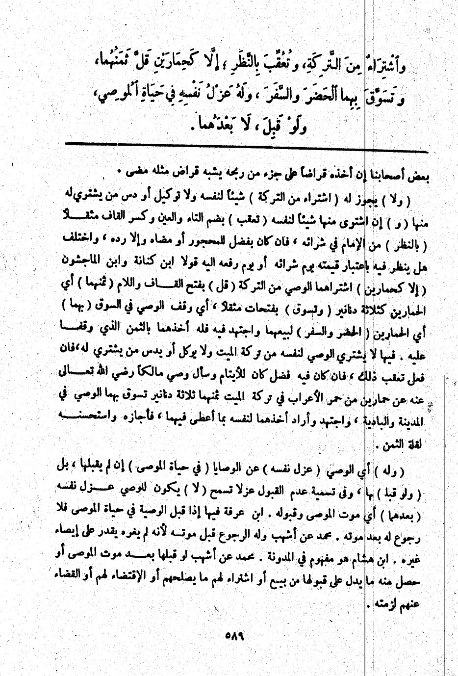 (وَلَا) يَجُوزُ لَهُ (اشْتِرَاءٌ مِنْ التَّرِكَةِ) شَيْئًا لِنَفْسِهِ وَلَا تَوْكِيلٌ أَوْ دَسُّ مَنْ يَشْتَرِي لَهُ مِنْهَا (وَ) إنْ اشْتَرَى مِنْهَا شَيْئًا لِنَفْسِهِ (تُعُقِّبَ) بِضَمِّ التَّاءِ وَالْعَيْنِ وَكَسْرِ الْقَافِ مُثَقَّلًا (بِالنَّظَرِ) مِنْ الْإِمَامِ فِي شِرَائِهِ، فَإِنْ كَانَ بِفَضْلٍ لِلْمَحْجُورِ أَمْضَاهُ، وَإِلَّا رَدَّهُ، وَاخْتُلِفَ هَلْ يَنْظُرُ فِيهِ بِاعْتِبَارِ قِيمَتِهِ يَوْمَ شِرَائِهِ أَوْ يَوْمَ رَفْعِهِ إلَيْهِ قَوْلَا ابْنِ كِنَانَةَ وَابْنِ الْمَاجِشُونِ. (إلَّا كَحِمَارَيْنِ) اشْتَرَاهُمَا الْوَصِيُّ مِنْ التَّرِكَةِ (قَلَّ) بِفَتْحِ الْقَافِ وَاللَّامِ (ثَمَنُهُمَا) أَيْ الْحِمَارَيْنِ كَثَلَاثَةِ دَنَانِيرَ (وَتَسَوَّقَ) بِفَتَحَاتٍ مُثَقَّلًا، أَيْ وَقَفَ الْوَصِيُّ فِي السُّوقِ (بِهِمَا) أَيْ الْحِمَارَيْنِ (الْحَضَرِ وَالسَّفَرِ) لِبَيْعِهِمَا وَاجْتَهَدَ فِيهِ فَلَهُ أَخْذُهُمَا بِالثَّمَنِ الَّذِي وَقَفَا عَلَيْهِ. فِيهَا لَا يَشْتَرِي الْوَصِيُّ لِنَفْسِهِ مِنْ تَرِكَةِ الْمَيِّتِ، وَلَا يُوَكِّلُ أَوْ يَدُسُّ مَنْ يَشْتَرِي لَهُ، فَإِنْ فَعَلَ تُعُقِّبَ ذَلِكَ، فَإِنْ كَانَ فِيهِ فَضْلٌ كَانَ لِلْأَيْتَامِ، وَسَأَلَ وَصِيٌّ مَالِكًا - رَضِيَ اللَّهُ تَعَالَى عَنْهُ - عَنْ حِمَارَيْنِ مِنْ حُمُرِ الْأَعْرَابِ فِي تَرِكَةِ الْمَيِّتِ ثَمَنُهُمَا ثَلَاثَةُ دَنَانِيرَ تَسَوَّقَ بِهِمَا الْوَصِيُّ فِي الْمَدِينَةِ وَالْبَادِيَةِ، وَاجْتَهَدَ وَأَرَادَ أَخْذَهُمَا لِنَفْسِهِ بِمَا أُعْطِيَ فِيهِمَا، فَأَجَازَهُ وَاسْتَحْسَنَهُ لِقِلَّةِ الثَّمَنِ.