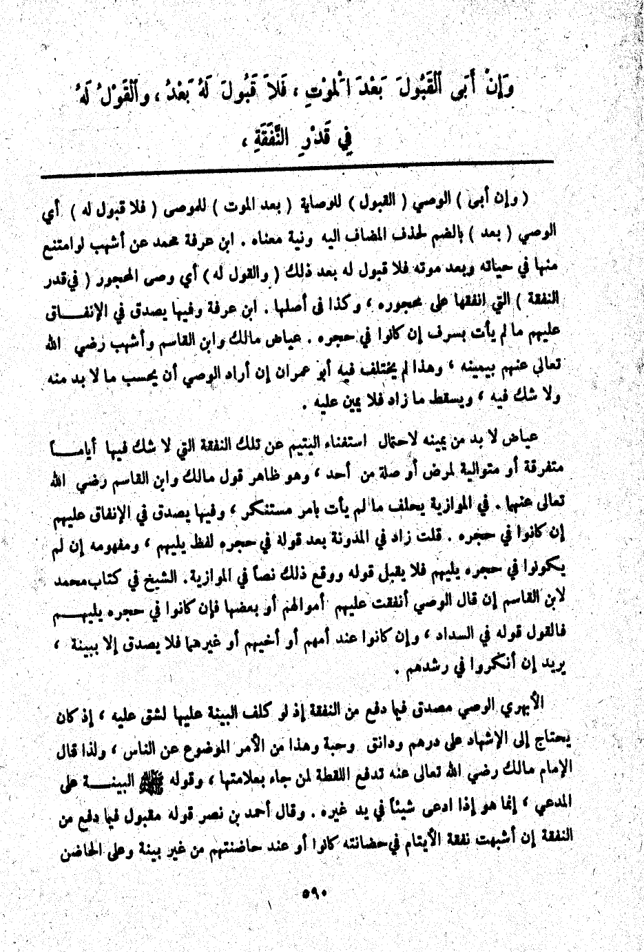 (وَالْقَوْلُ لَهُ) أَيْ وَصِيِّ الْمَحْجُورِ (فِي قَدْرِ النَّفَقَةِ) الَّتِي أَنْفَقَهَا عَلَى مَحْجُورِهِ، وَكَذَا فِي أَصْلِهَا. ابْنُ عَرَفَةَ وَفِيهَا يُصَدَّقُ فِي الْإِنْفَاقِ عَلَيْهِمْ مَا لَمْ يَأْتِ بِسَرَفٍ إنْ كَانُوا فِي حِجْرِهِ. عِيَاضٌ مَالِكٌ وَابْنُ الْقَاسِمِ وَأَشْهَبُ - رَضِيَ اللَّهُ تَعَالَى عَنْهُمْ - بِيَمِينِهِ، وَهَذَا لَمْ يَخْتَلِفْ فِيهِ أَبُو عِمْرَانَ إنْ أَرَادَ الْوَصِيُّ أَنْ يَحْسِبَ مَا لَا بُدَّ مِنْهُ، وَلَا شَكَّ فِيهِ، وَيَسْقُطُ مِمَّا زَادَ فَلَا يَمِينَ عَلَيْهِ.
