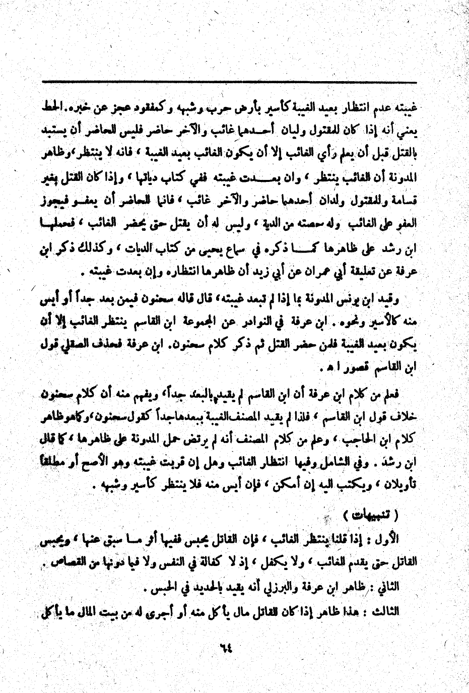 وَقَيَّدَ ابْنُ يُونُسَ الْمُدَوَّنَةَ بِمَا إذَا لَمْ تَبْعُدْ غَيْبَتُهُ، قَالَ قَالَهُ سَحْنُونٌ فِيمَنْ بَعُدَ جِدًّا أَوْ أُيِسَ مِنْهُ كَالْأَسِيرِ وَنَحْوِهِ. ابْنُ عَرَفَةَ فِي النَّوَادِرِ عَنْ الْمَجْمُوعَةِ ابْنُ الْقَاسِمِ يُنْتَظَرُ الْغَائِبُ إلَّا أَنْ يَكُونَ بَعِيدَ الْغَيْبَةِ فَلِمَنْ حَضَرَ الْقَتْلُ ثُمَّ ذَكَرَ كَلَامَ سَحْنُونٍ. ابْنُ عَرَفَةَ فَحَذْفُ الصِّقِلِّيُّ قَوْلَ ابْنِ الْقَاسِمِ قُصُورٌ اهـ.