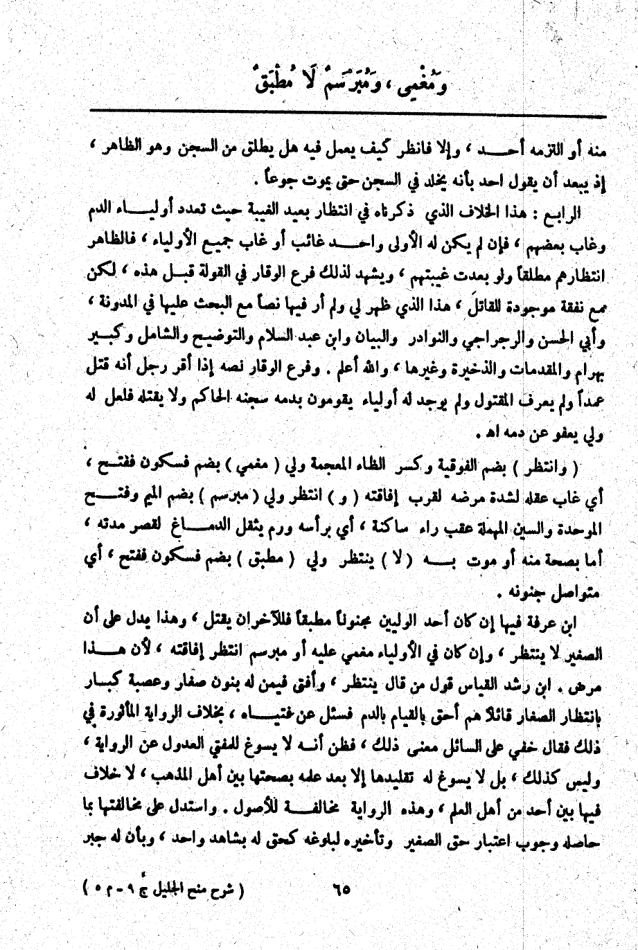 ابْنُ عَرَفَةَ فِيهَا إنْ كَانَ أَحَدُ الْوَلِيَّيْنِ مَجْنُونًا مُطْبَقًا فَلِلْآخَرِ أَنْ يَقْتُلَ، وَهَذَا يَدُلُّ عَلَى أَنَّ الصَّغِيرَ لَا يُنْتَظَرُ، وَإِنْ كَانَ فِي الْأَوْلِيَاءِ مُغْمًى عَلَيْهِ أَوْ مُبَرْسَمٌ اُنْتُظِرَ إفَاقَتُهُ لِأَنَّ هَذَا مَرَضٌ. ابْنُ رُشْدٍ الْقِيَاسُ قَوْلُ مَنْ قَالَ يُنْتَظَرُ، وَأَفْتَى فِيمَنْ لَهُ بَنُونَ صِغَارٌ وَعُصْبَةٌ كِبَارٌ بِانْتِظَارِ الصِّغَارِ قَائِلًا هُمْ أَحَقُّ بِالْقِيَامِ بِالدَّمِ فَسُئِلَ عَنْ فَتَيَاهُ، بِخِلَافِ الرِّوَايَةِ الْمَأْثُورَةِ فِي ذَلِكَ فَقَالَ خَفِيَ عَلَى السَّائِلِ مَعْنَى ذَلِكَ، فَظَنَّ أَنَّهُ لَا يَسُوغُ لِلْمُفْتِي الْعُدُولُ عَنْ الرِّوَايَةِ، وَلَيْسَ كَذَلِكَ، بَلْ لَا يَسُوغُ لَهُ تَقْلِيدُهَا إلَّا بَعْدَ عِلْمِهِ بِصِحَّتِهَا بَيْنَ أَهْلِ الْمَذْهَبِ، لَا خِلَافَ فِيهَا بَيْنَ أَحَدٍ مِنْ أَهْلِ الْعِلْمِ، وَهَذِهِ الرِّوَايَةُ مُخَالِفَةٌ لِلْأُصُولِ. وَاسْتَدَلَّ عَلَى مُخَالَفَتِهَا بِمَا حَاصِلُهُ وُجُوبُ اعْتِبَارِ حَقِّ الصَّغِيرِ وَتَأْخِيرُهُ لِبُلُوغِهِ كَحَقٍّ لَهُ بِشَاهِدٍ وَاحِدٍ، وَبِأَنَّ لَهُ جَبْرَ