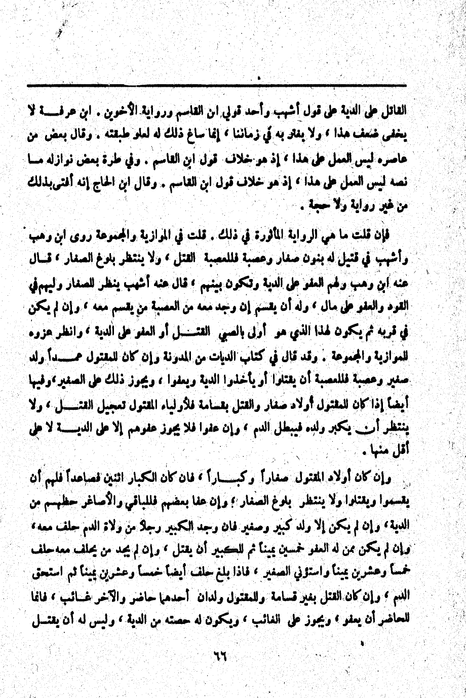 ـــــــــــــــــــــــــــــQالْقَاتِلِ عَلَى الدِّيَةِ عَلَى قَوْلِ أَشْهَبَ وَأَحَدِ قَوْلَيْ ابْنِ الْقَاسِمِ وَرِوَايَةِ الْأَخَوَيْنِ. ابْنُ عَرَفَةَ لَا يَخْفَى ضَعْفُ هَذَا، وَلَا يُغْتَرُّ بِهِ فِي زَمَانِنَا، إنَّمَا سَاغَ ذَلِكَ لَهُ لِعُلُوِّ طَبَقَتِهِ. وَقَالَ بَعْضُ مَنْ عَاصَرَهُ لَيْسَ الْعَمَلُ عَلَى هَذَا، إذْ هُوَ خِلَافُ قَوْلِ ابْنِ الْقَاسِمِ. وَفِي طُرَّةِ بَعْضِ نَوَازِلِهِ مَا نَصُّهُ لَيْسَ الْعَمَلُ عَلَى هَذَا، إذْ هُوَ خِلَافُ قَوْلِ ابْنِ الْقَاسِمِ. وَقَالَ ابْنُ الْحَاجِّ إنَّهُ أَفْتَى بِذَلِكَ مِنْ غَيْرِ رِوَايَةٍ وَلَا حُجَّةٍ.