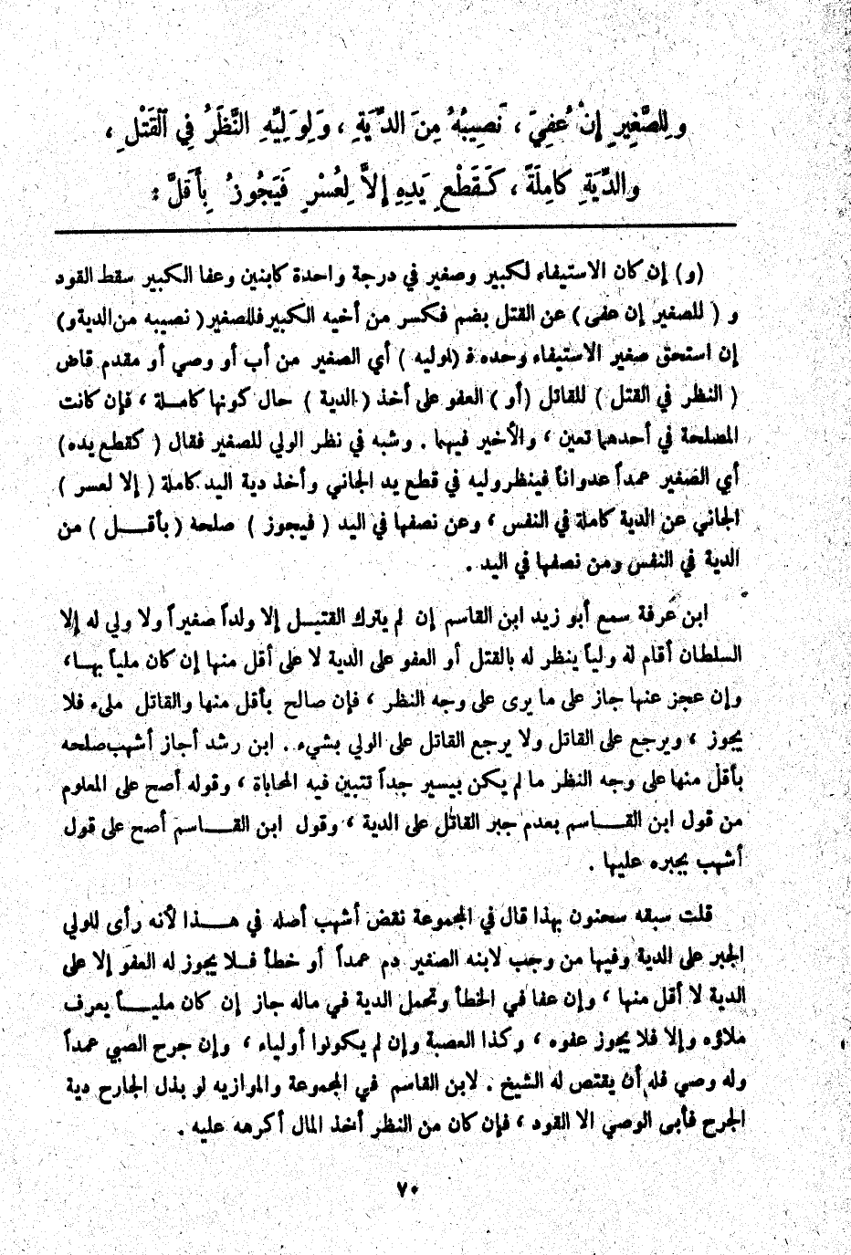 ابْنُ عَرَفَةَ سَمِعَ أَبُو زَيْدٍ ابْنَ الْقَاسِمِ إنْ لَمْ يَتْرُكْ الْقَتِيلُ إلَّا وَلَدًا صَغِيرًا وَلَا وَلِيَّ لَهُ إلَّا السُّلْطَانُ أَقَامَ لَهُ وَلِيًّا يَنْظُرُ لَهُ بِالْقَتْلِ أَوْ الْعَفْوِ عَلَى الدِّيَةِ لَا عَلَى أَقَلَّ مِنْهَا إنْ كَانَ مَلِيئًا بِهَا، وَإِنْ عَجَزَ عَنْهَا جَازَ عَلَى مَا يَرَى عَلَى وَجْهِ النَّظَرِ، فَإِنْ صَالَحَ بِأَقَلَّ مِنْهَا وَالْقَاتِلُ مَلِيءٌ فَلَا يَجُوزُ، وَيَرْجِعُ عَلَى الْقَاتِلِ وَلَا يَرْجِعُ الْقَاتِلُ عَلَى الْوَلِيِّ بِشَيْءٍ. ابْنُ رُشْدٍ أَجَازَ أَشْهَبُ صُلْحَهُ بِأَقَلَّ مِنْهَا عَلَى وَجْهِ النَّظَرِ مَا لَمْ يَكُنْ بِيَسِيرٍ جِدًّا تَتَبَيَّنُ فِيهِ الْمُحَابَاةُ، وَقَوْلُهُ أَصَحُّ عَلَى الْمَعْلُومِ مِنْ قَوْلِ ابْنِ الْقَاسِمِ بِعَدَمِ جَبْرِ الْقَاتِلِ عَلَى الدِّيَةِ، وَقَوْلُ ابْنِ الْقَاسِمِ أَصَحُّ عَلَى قَوْلِ أَشْهَبَ يَجْبُرُهُ عَلَيْهَا.