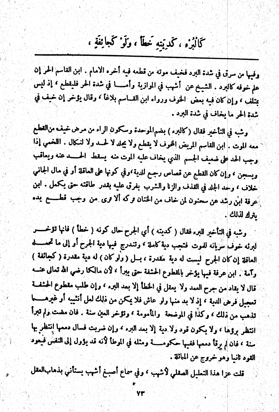 ـــــــــــــــــــــــــــــQوَفِيهَا مَنْ سَرَقَ فِي شِدَّةِ الْبَرْدِ فَخِيفَ مَوْتُهُ مِنْ قَطْعِهِ فِيهِ أَخَّرَهُ الْإِمَامُ. ابْنُ الْقَاسِمِ الْحَرُّ إنْ عُلِمَ خَوْفُهُ كَالْبَرْدِ. الشَّيْخُ عَنْ أَشْهَبَ فِي الْمَوَّازِيَّةِ وَأَمَّا فِي شِدَّةِ الْحَرِّ فَلْيَقْطَعْ، إذْ لَيْسَ بِمُتْلِفٍ، وَإِنْ كَانَ فِيهِ بَعْضُ الْخَوْفِ وَرَوَاهُ ابْنُ الْقَاسِمِ بَلَاغًا، وَقَالَ يُؤَخِّرُ إنْ خِيفَ فِي شِدَّةِ الْحَرِّ مَا يُخَافُ فِي شِدَّةِ الْبَرْدِ.