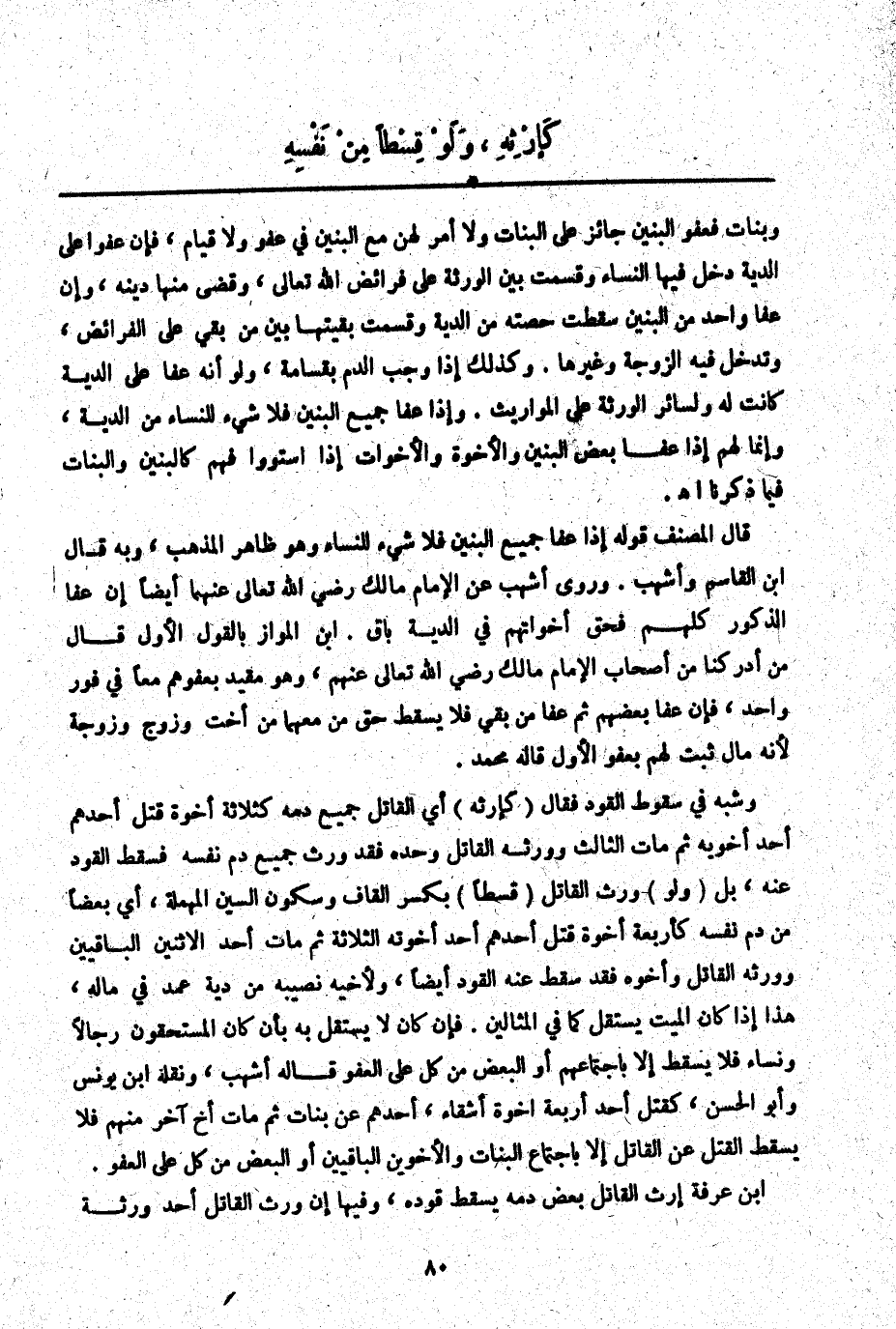 ابْنُ عَرَفَةَ إرْثُ الْقَاتِلِ بَعْضَ دَمِهِ يُسْقِطُ قَوَدَهُ، وَفِيهَا إنْ وَرِثَ الْقَاتِلُ أَحَدَ وَرَثَةِ