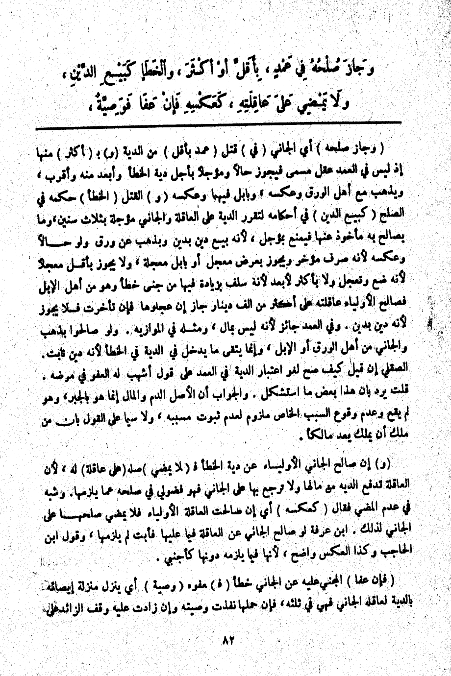 ـــــــــــــــــــــــــــــQوَجَازَ صُلْحُهُ) أَيْ الْجَانِي (فِي) قَتْلِ (عَمْدٍ بِأَقَلَّ) مِنْ الدِّيَةِ (وَ) بِ (أَكْثَرَ) مِنْهَا إذْ لَيْسَ فِي الْعَمْدِ عَقْلٌ مُسَمًّى فَيَجُوزُ حَالًّا وَمُؤَجَّلًا بِأَجَلِ دِيَةِ الْخَطَأِ وَأَبْعَدَ مِنْهُ وَأَقْرَبَ، وَبِذَهَبٍ مَعَ أَهْلِ الْوَرِقِ وَعَكْسُهُ، وَبِإِبِلٍ فِيهِمَا وَعَكْسُهُ (وَ) الْقَتْلُ (الْخَطَأُ) حُكْمُهُ فِي الصُّلْحِ (كَبَيْعِ الدَّيْنِ) فِي أَحْكَامِهِ لِتَقَرُّرِ الدِّيَةِ عَلَى الْعَاقِلَةِ وَالْجَانِي مُؤَجَّلَةً بِثَلَاثِ سِنِينَ، وَمَا يُصَالِحُ بِهِ مَأْخُوذٌ عَنْهَا فَيُمْنَعُ بِمُؤَجَّلٍ، أَنَّهُ بَيْعُ دَيْنٍ بِدَيْنٍ وَبِذَهَبٍ عَنْ وَرِقٍ وَلَوْ حَالًّا وَعَكْسُهُ لِأَنَّهُ صَرْفٌ مُؤَخَّرٌ وَيَجُوزُ بِعَرَضٍ مُعَجَّلٍ أَوْ بِإِبِلٍ مُعَجَّلَةٍ، وَلَا يَجُوزُ بِأَقَلَّ مُعَجَّلًا لِأَنَّهُ ضَعْ وَتَعَجَّلْ وَلَا بِأَكْثَرَ لِأَبْعَدَ لِأَنَّهُ سَلَفٌ بِزِيَادَةٍ فِيهَا مَنْ جَنَى خَطَأً وَهُوَ مِنْ أَهْلِ الْإِبِلِ فَصَالَحَ الْأَوْلِيَاءُ عَاقِلَتَهُ عَلَى أَكْثَرَ مِنْ أَلْفِ دِينَارٍ جَازَ إنْ عَجَّلُوهَا فَإِنْ تَأَخَّرَتْ فَلَا يَجُوزُ لِأَنَّهُ دَيْنٌ بِدَيْنٍ. وَفِي الْعَمْدِ جَائِزٌ لِأَنَّهُ لَيْسَ بِمَالٍ، وَمِثْلُهُ فِي الْمَوَّازِيَّةِ. وَلَوْ صَالَحُوا بِذَهَبٍ وَالْجَانِي مِنْ أَهْلِ الْوَرِقِ أَوْ الْإِبِلِ، وَإِنَّمَا يُتَّقَى مَا يَدْخُلُ فِي الدِّيَةِ فِي الْخَطَأِ لِأَنَّهُ دَيْنٌ ثَابِتٌ. الصِّقِلِّيُّ إنْ قِيلَ كَيْفَ صَحَّ لَغْوُ اعْتِبَارِ الدِّيَةِ فِي الْعَمْدِ عَلَى قَوْلِ أَشْهَبَ لَهُ الْعَفْوُ فِي مَرَضِهِ. قُلْت يُرَدُّ بِأَنَّ هَذَا بَعْضُ مَا اسْتَشْكَلَ. وَالْجَوَابُ أَنَّ الْأَصْلَ الدَّمُ وَالْمَالُ إنَّمَا هُوَ بِالْجَبْرِ، وَهُوَ لَمْ يَقَعْ وَعَدَمُ وُقُوعِ السَّبَبِ الْخَاصِّ مَلْزُومٌ لِعَدَمِ ثُبُوتِ مُسَبَّبِهِ، وَلَا سِيَّمَا عَلَى الْقَوْلِ بِأَنَّ مَنْ مَلَكَ أَنْ يَمْلِكَ يُعَدُّ مَالِكًا.