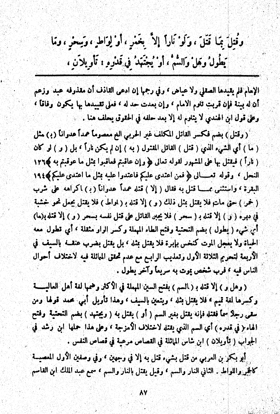 (وَهَلْ وَ) إلَّا قَتْلَهُ بِ (السُّمِّ) بِفَتْحِ السِّينِ الْمُهْمَلَةِ فِي الْأَكْثَرِ وَضَمِّهَا لُغَةُ أَهْلِ الْعَالِيَةِ وَكَسْرِهَا لُغَةُ تَمِيمٍ، فَلَا يُقْتَلُ بِمِثْلِهِ، وَيَتَعَيَّنُ بِالسَّيْفِ، وَهَذَا تَأْوِيلُ أَبِي مُحَمَّدٍ قَوْلُهَا وَمَنْ سَقَى رَجُلًا سُمًّا فَقَتَلَهُ فَإِنَّهُ يُقْتَلُ بِغَيْرِ السُّمِّ (أَوْ) يُقْتَلُ بِهِ (وَيُجْتَهَدُ) بِضَمِّ التَّحْتِيَّةِ وَفَتْحِ الْهَاءِ (فِي قَدْرِهِ) أَيْ السُّمِّ الَّذِي يَقْتُلُهُ لِاخْتِلَافِ الْأَمْزِجَةِ، وَعَلَى هَذَا حَمَلَهَا ابْنُ رُشْدٍ فِي الْجَوَابِ (تَأْوِيلَانِ) ابْنُ شَاسٍ الْمُمَاثَلَةُ فِي الْقِصَاصِ مَرْعِيَّةٌ فِي قِصَاصِ النَّفْسِ. أَبُو بَكْرِ بْنُ الْعَرَبِيِّ مَنْ قَتَلَ بِشَيْءٍ قُتِلَ بِهِ إلَّا فِي وَجْهَيْنِ، وَفِي وَصْفَيْنِ الْأَوَّلُ الْمَعْصِيَةُ كَالْخَمْرِ وَاللِّوَاطِ. الثَّانِي النَّارُ وَالسُّمُّ، وَقِيلَ يُقْتَلُ بِالنَّارِ وَالسُّمِّ، سَمِعَ عَبْدُ الْمَلِكِ ابْنَ الْقَاسِمِ